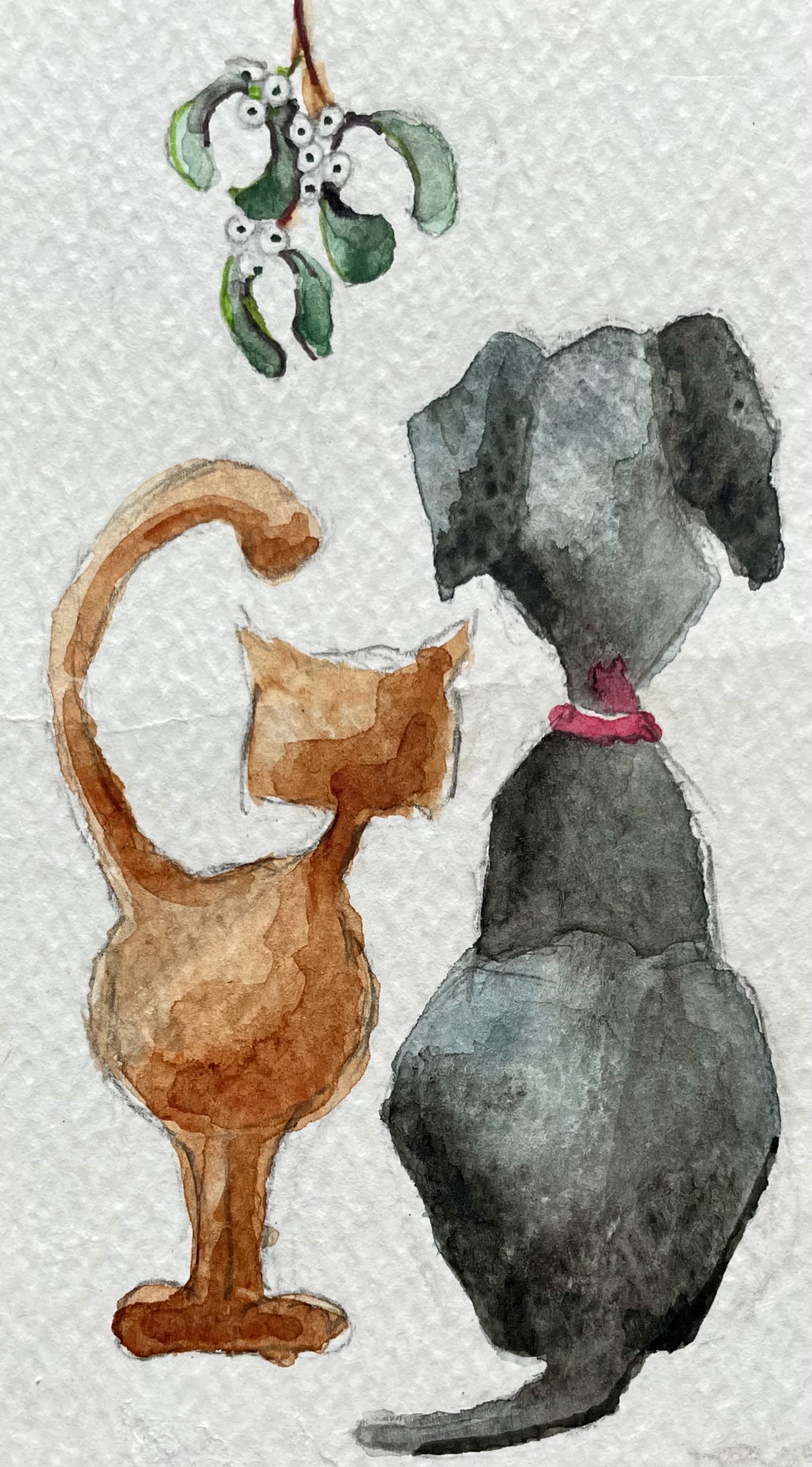 This is a water colour Christmas card for a dear friend. Depicting her beloved black Labrador and my ginger tom.