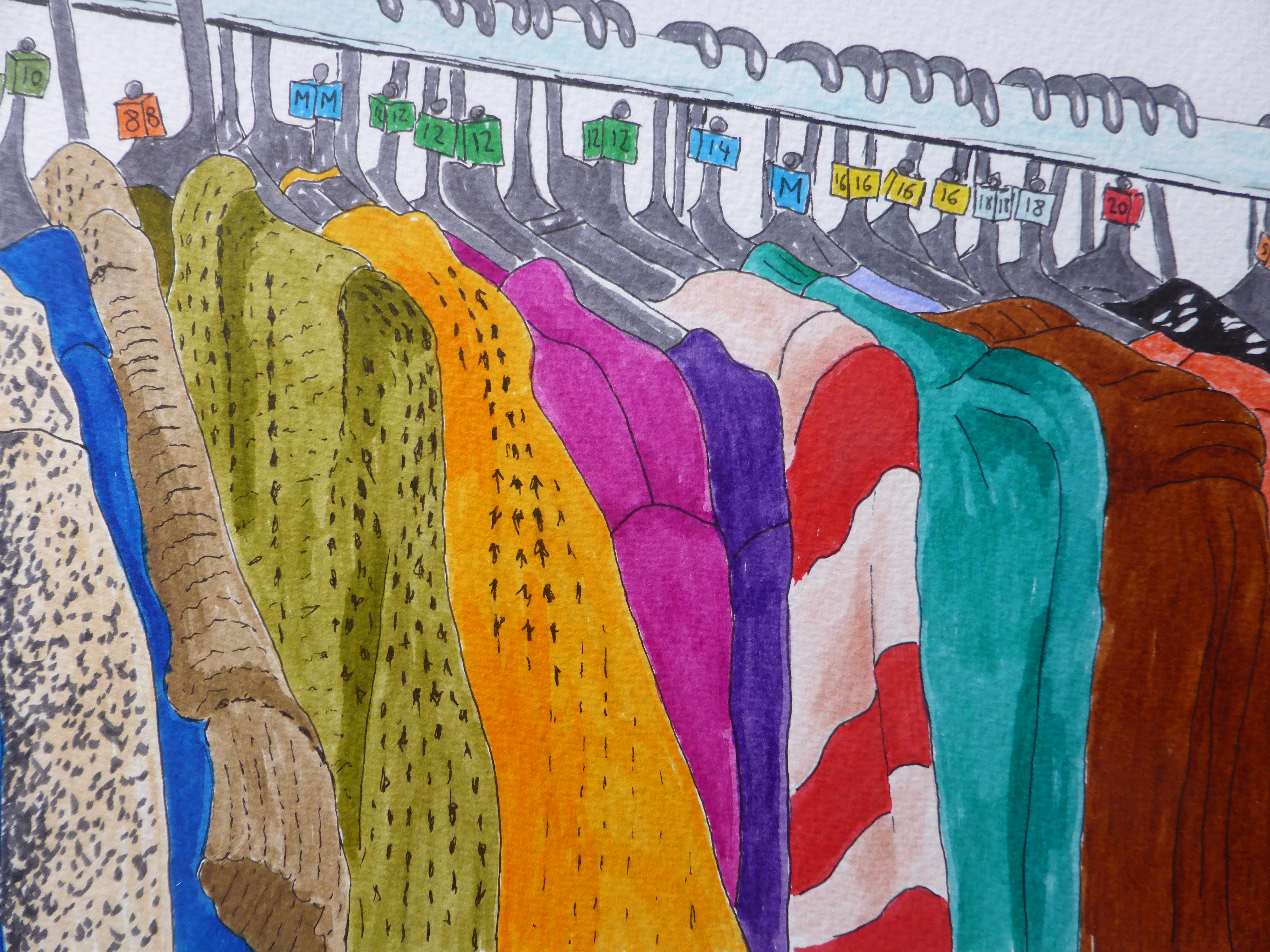 This is a pen drawing of a clothes rail in a charity shop.
