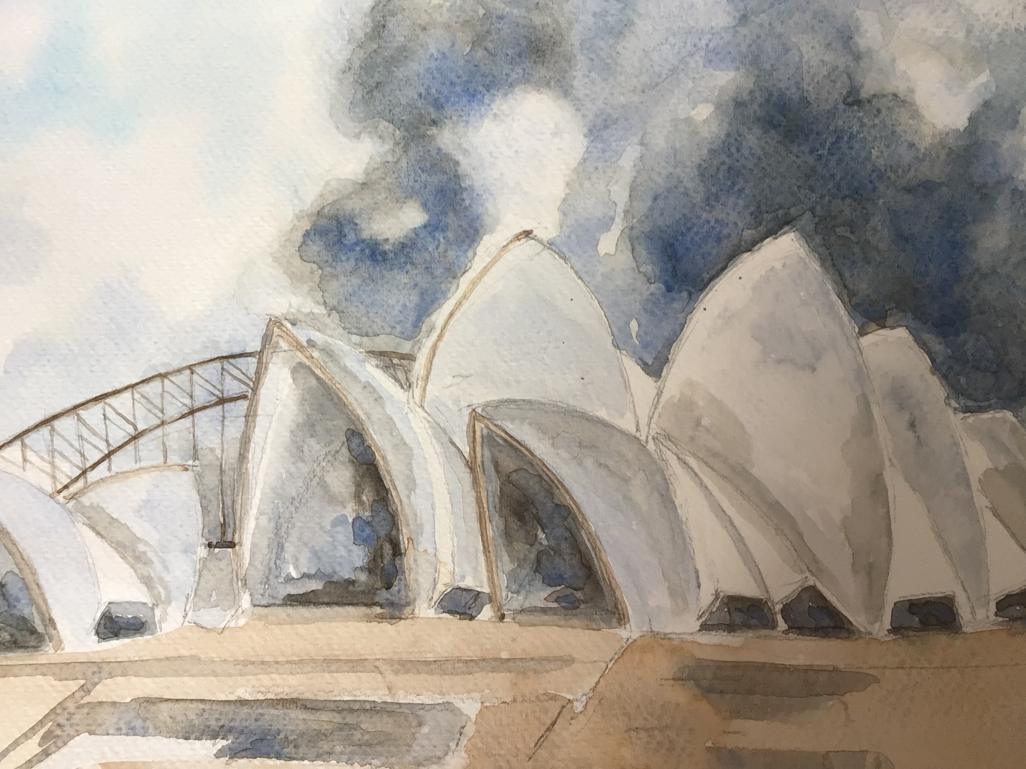 Different sizes of the sails of Sydney Opera House as viewed from other side against a stormy sky completed in watercolours.