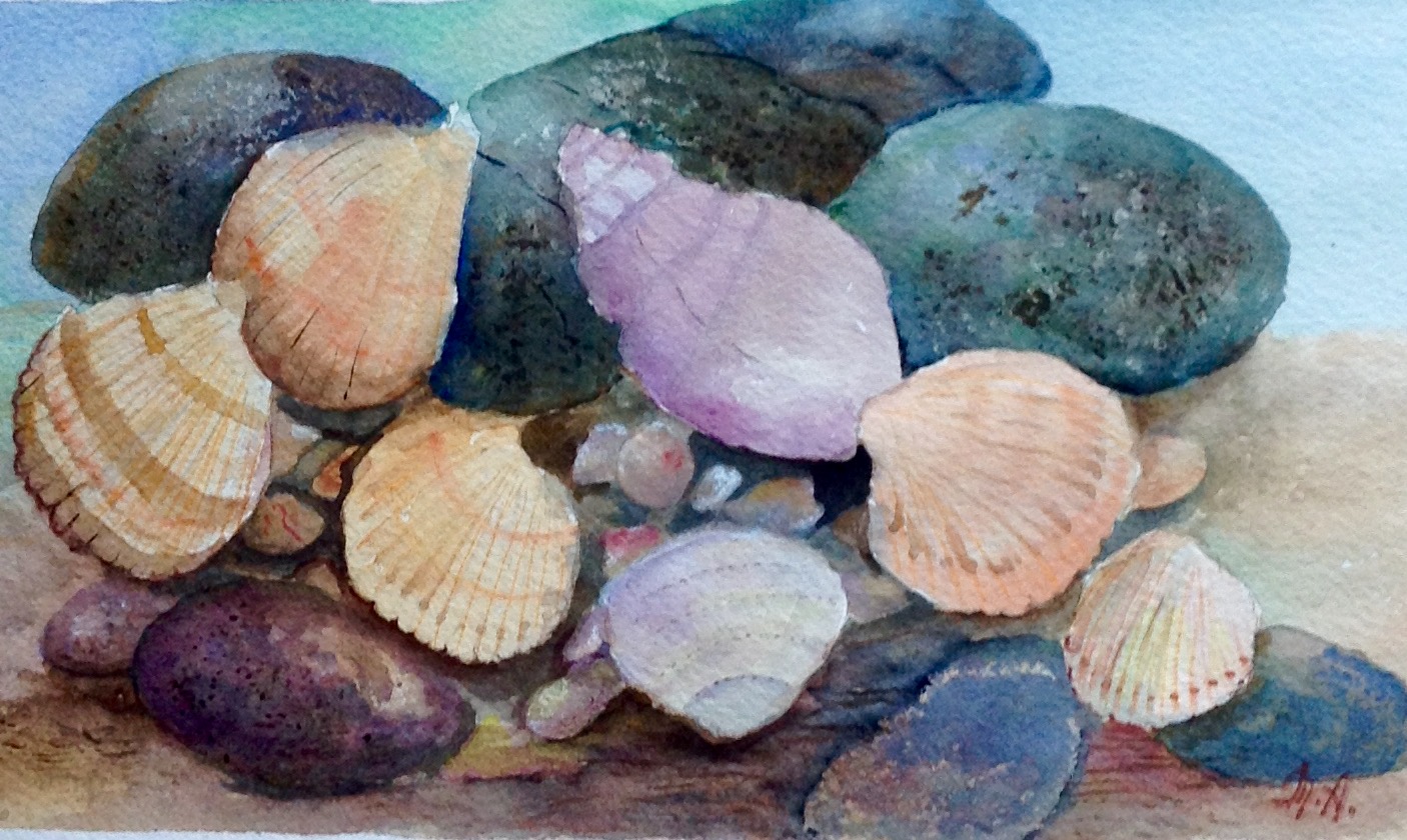 Watercolour.I love collecting them along the beach.This month’s title “Different sizes” could refer to just about anything on the planet!