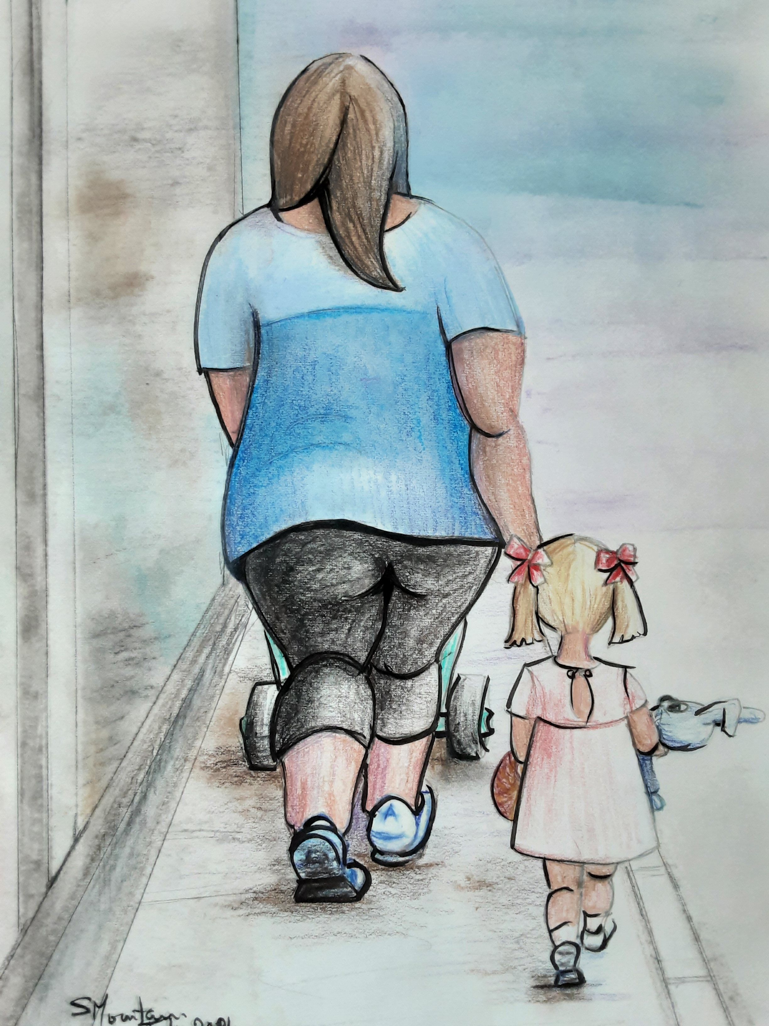 From memory - inspired by people. This is a fairly regular sight out grocery shopping. Harrassed mum and "cool" small child who is clearly living in their own imaginary world. Mostly coloured pencil, pastel and some ink brush. On paper.