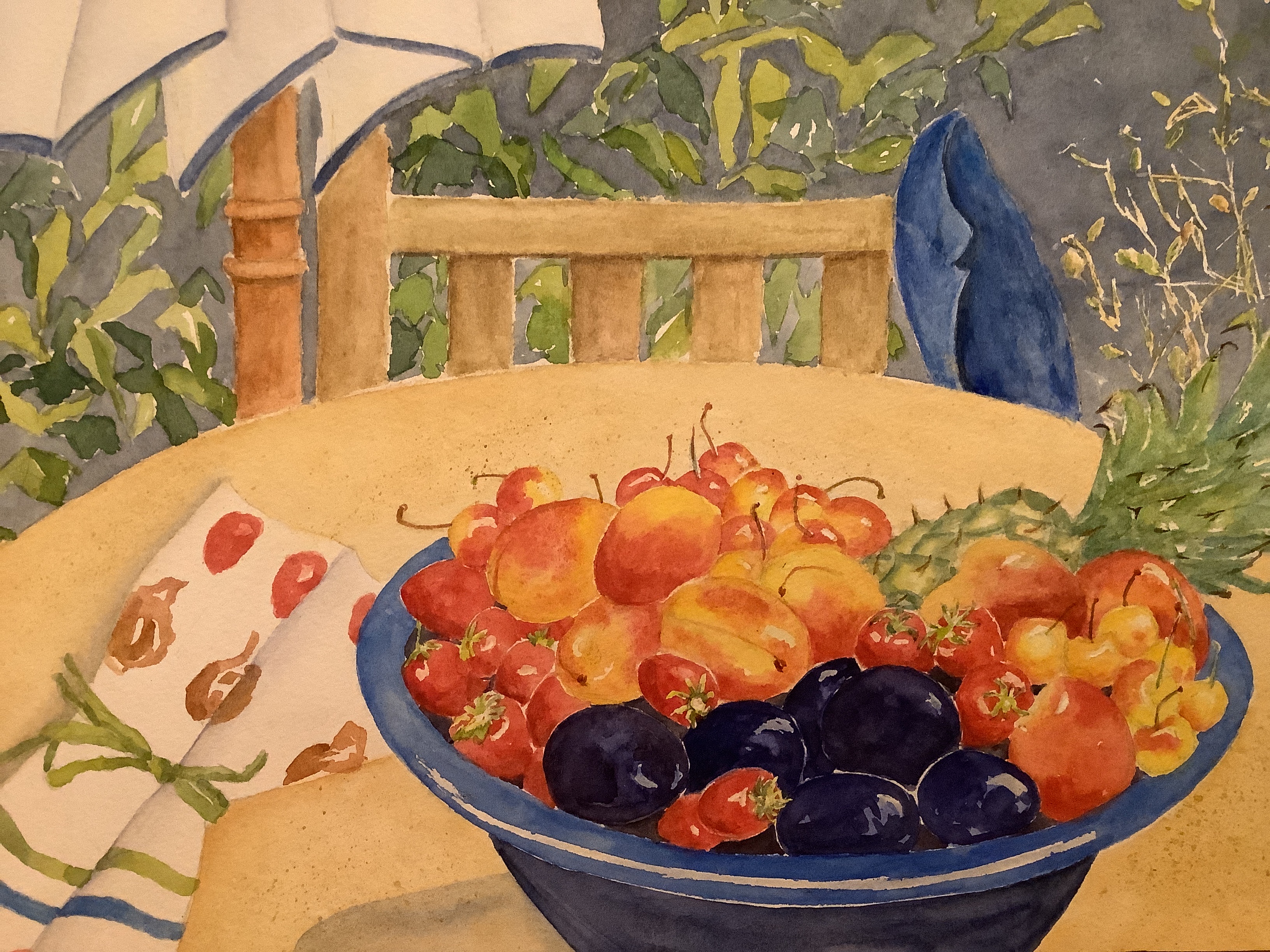 I’m looking forward to having meals outside in the warmth of the sun. Painted in watercolour.