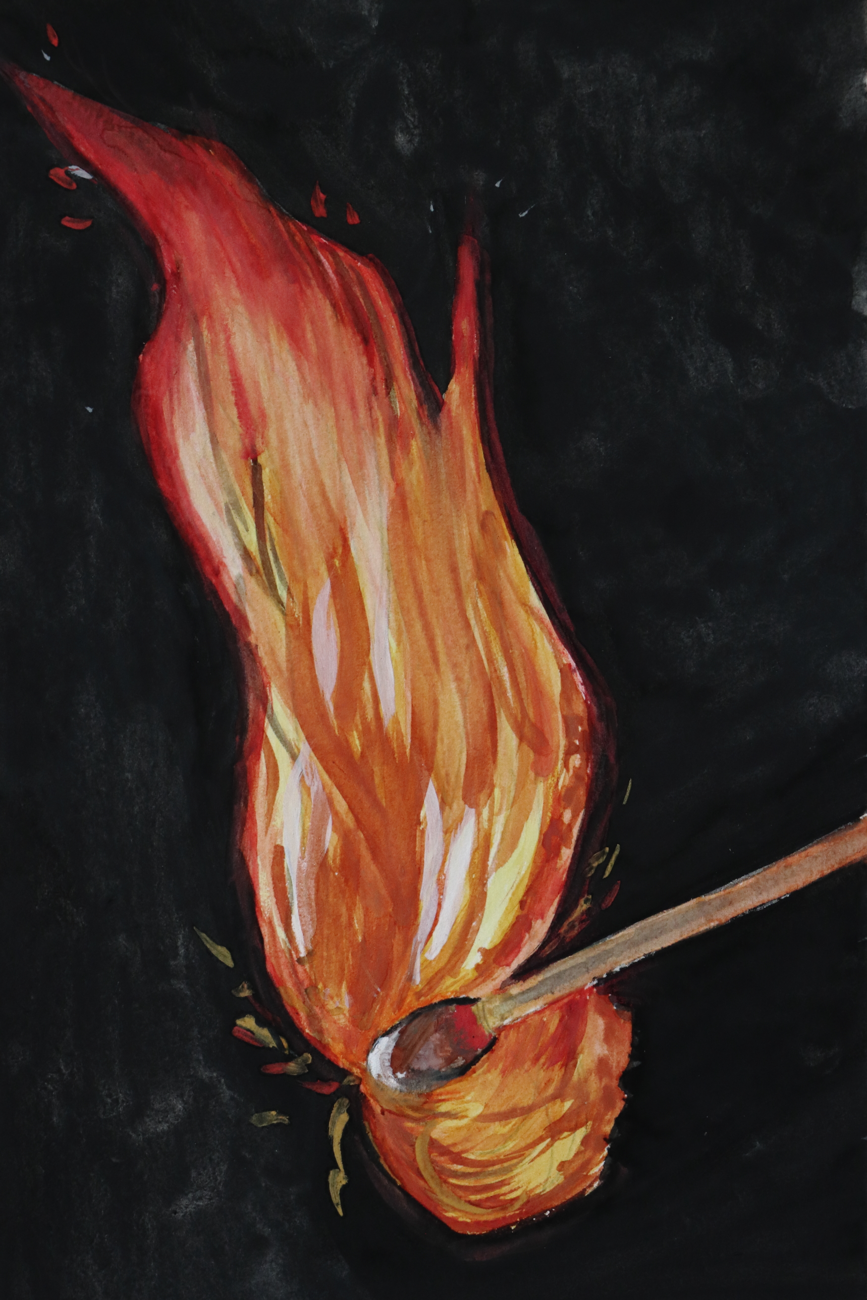 Painted in watercolour, a newly struck match emitting a light and a brief moment of warmth.