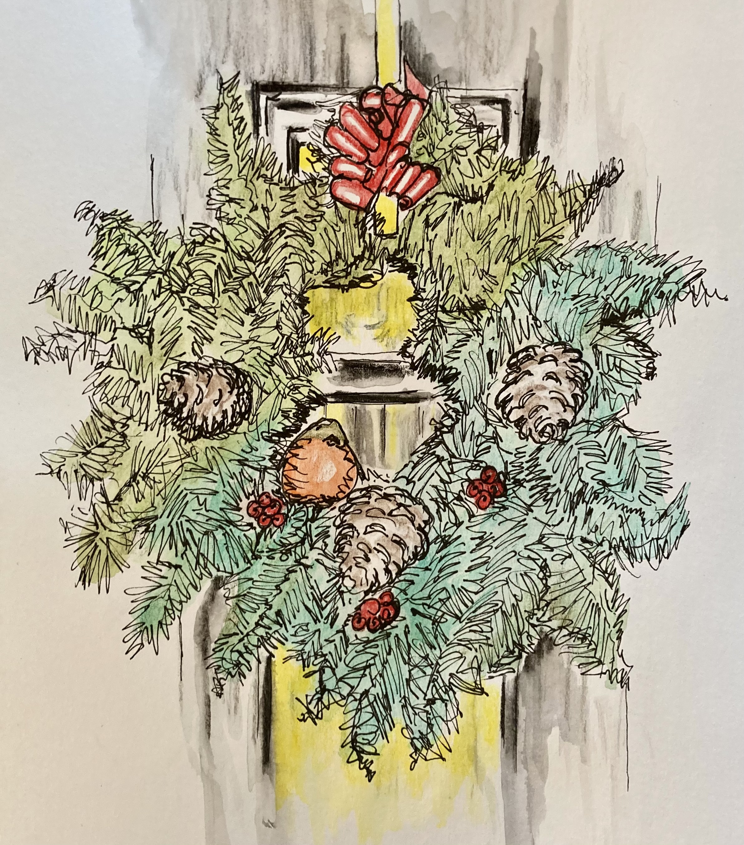 This is part of a diary type series, originally started during the first Covid lockdown. Pen and ink with a watercolour wash.