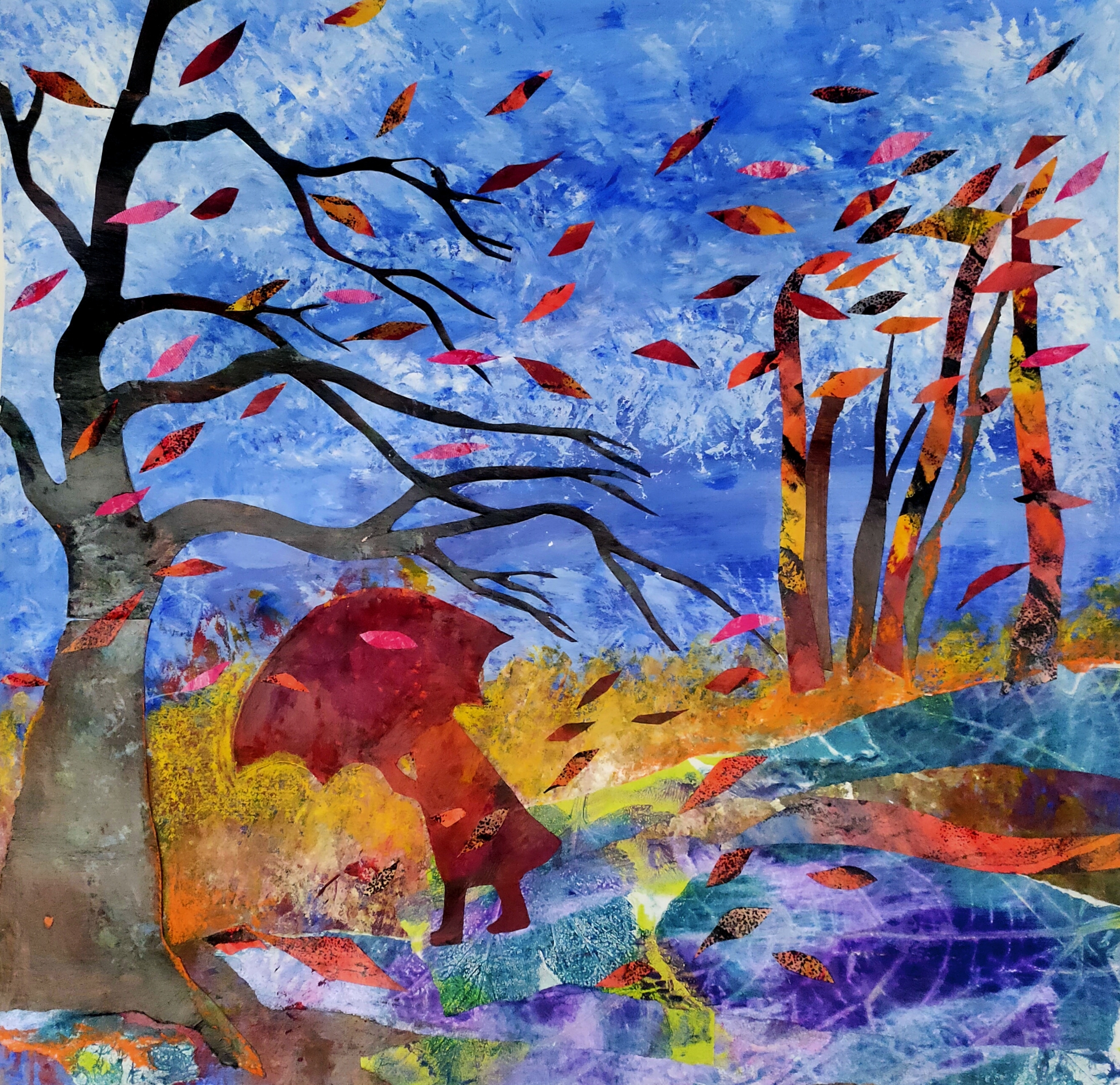 Collage using gel printed papers. Inspired by watching a small girl battle her umbrella on a windy day in November.