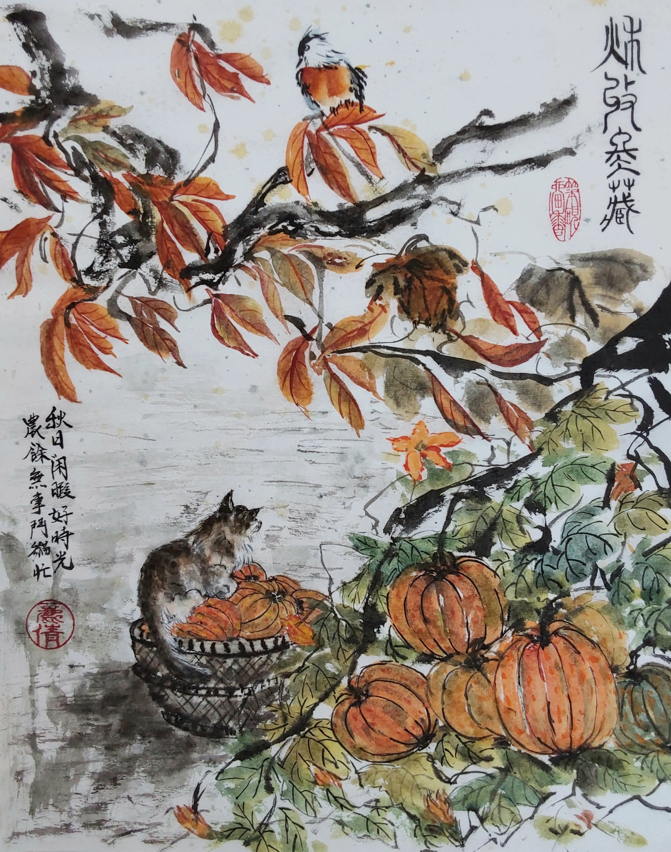Chinese Brush painting, harvest for Winter. Calligraphy: an Autumn afternoon just finished gardening work, relaxing and enjoying this nice weather. It's time to play with the cat a bit.