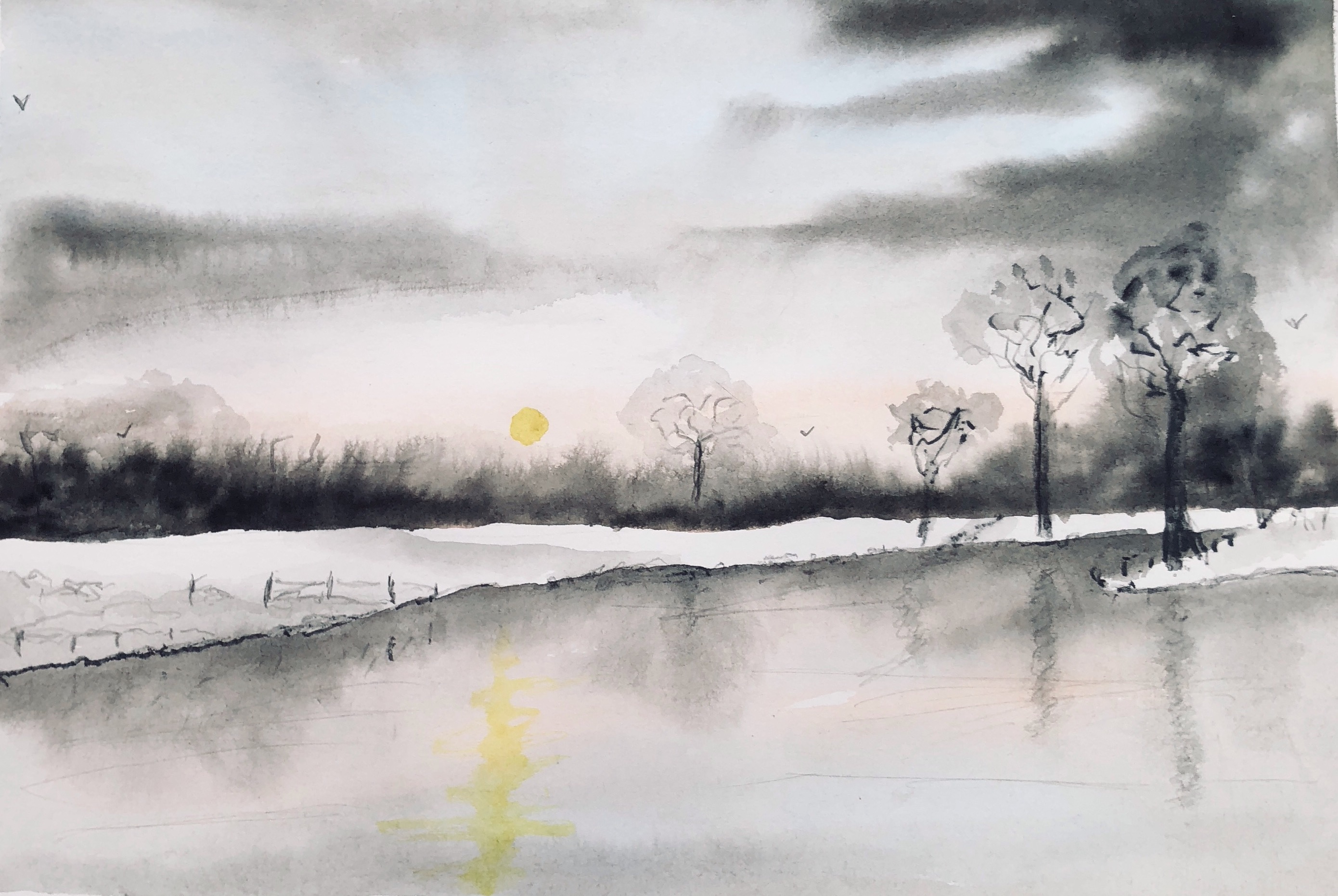A Walk Around Newmillerdam “Winter” – acrylic ink & watercolour A peaceful winter walk captured in brushstrokes — soft light, quiet reflections, and the stillness of the season.