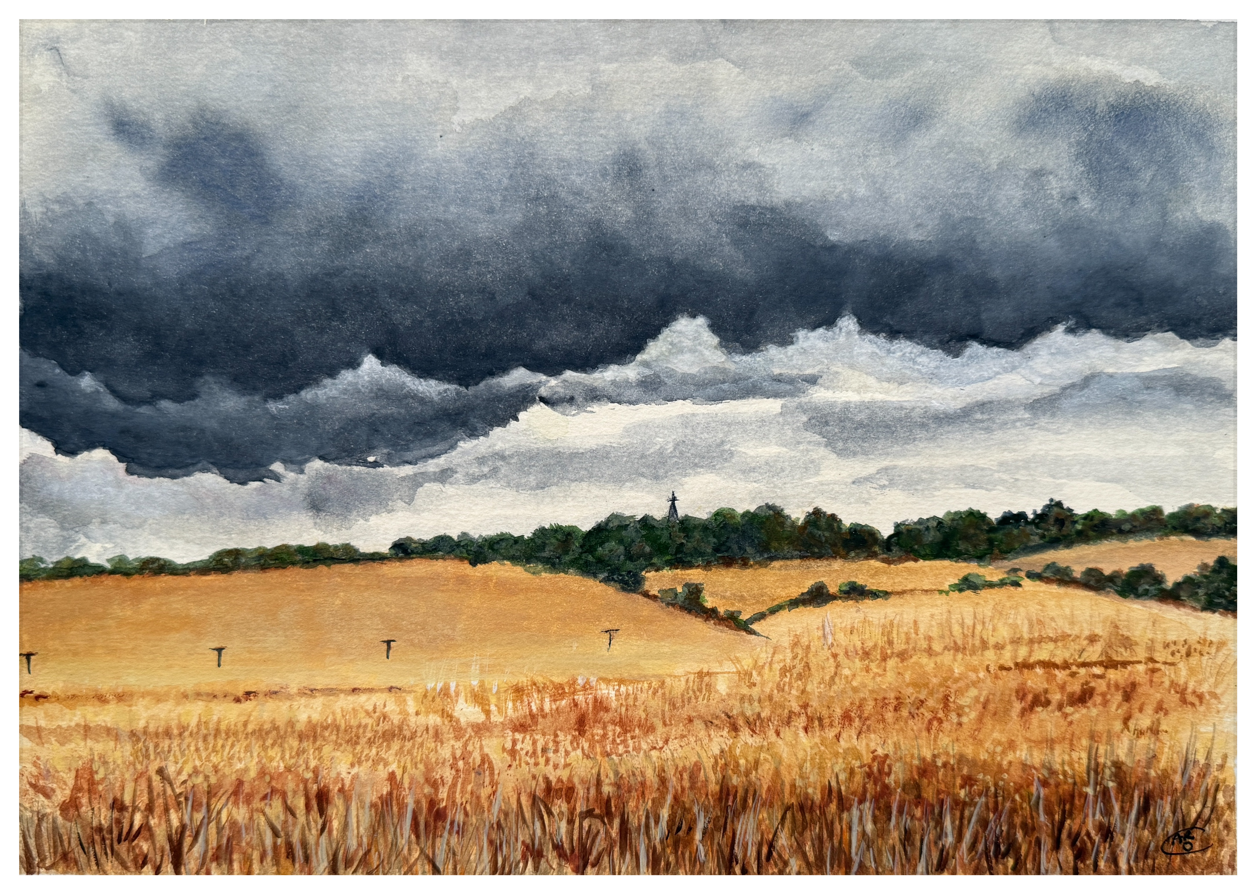 My granddaughter and I were driving in West Sussex and I was struck by the darkness of the threatening storm clouds over the golden fields so took a quick snapshot to paint it later in watercolour.
