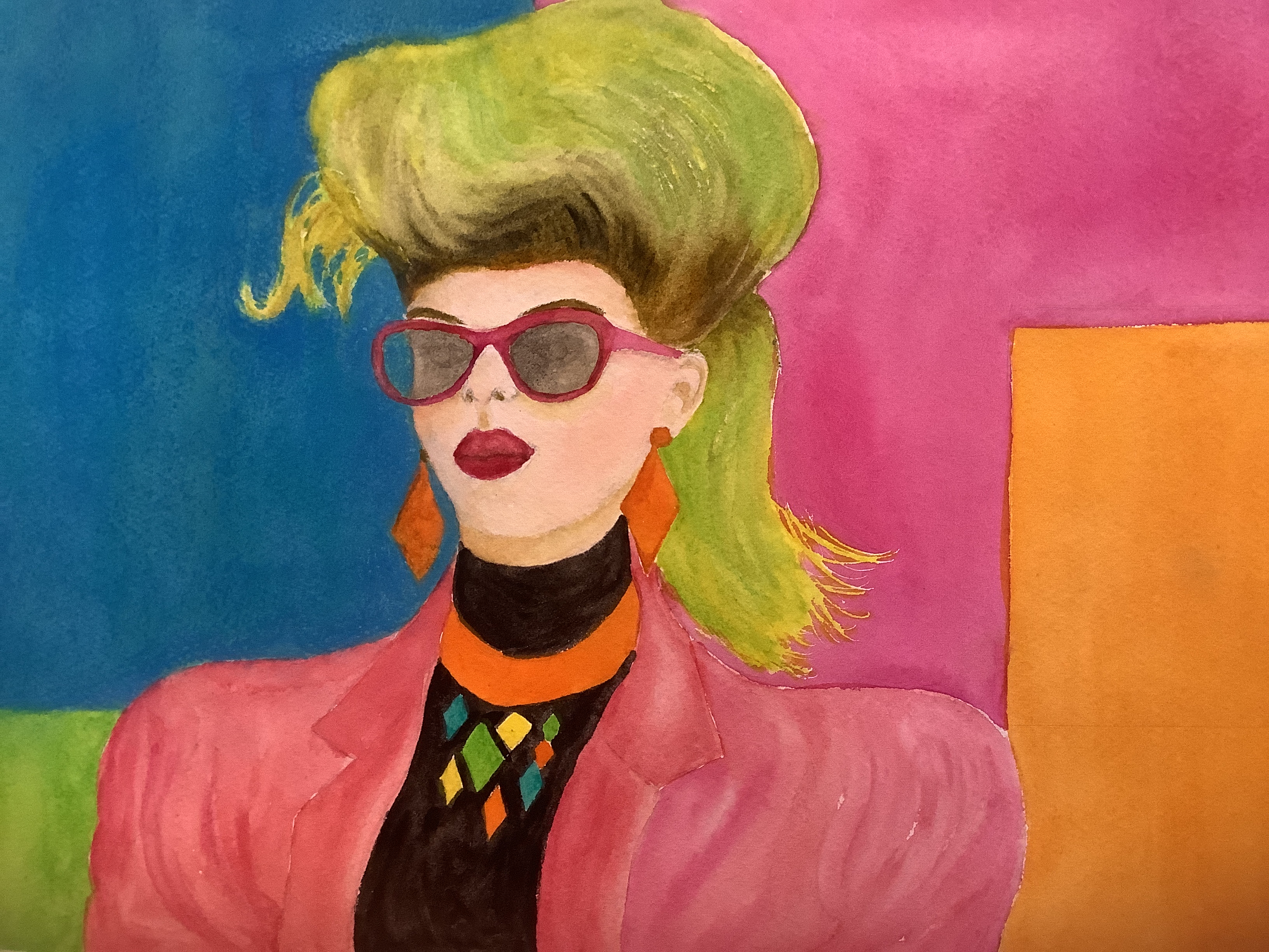 Big hair, big shoulder pads, platform shoes and shell suits - I hope they don’t have a revival! Painted in watercolour with pastel