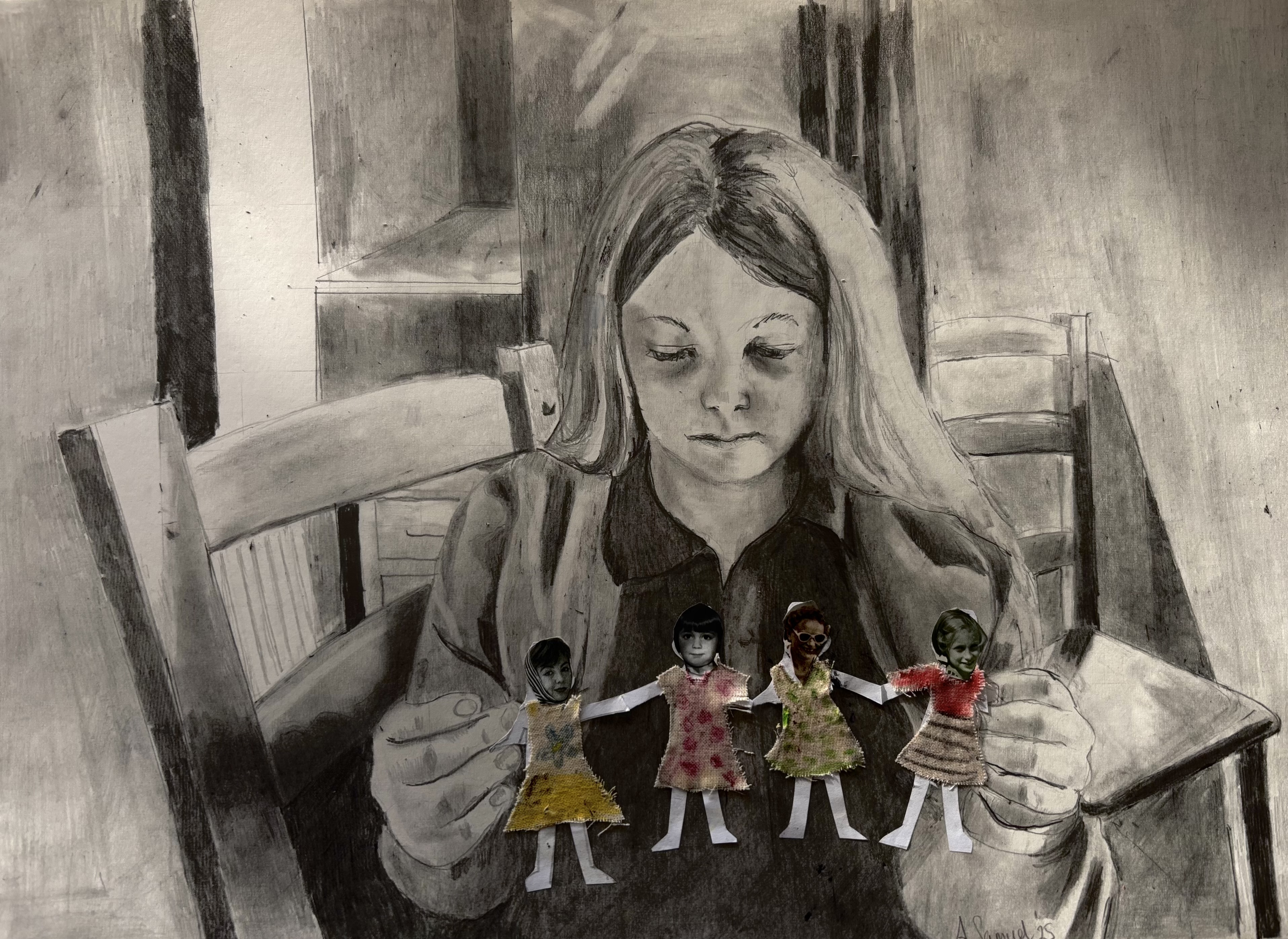 This was a moment in time with my daughter who was born in the early 1980'swhen we made paper chain dollies. This was an moment in time with my granddaughter when we made paper chain dollies. Graphite and calico.