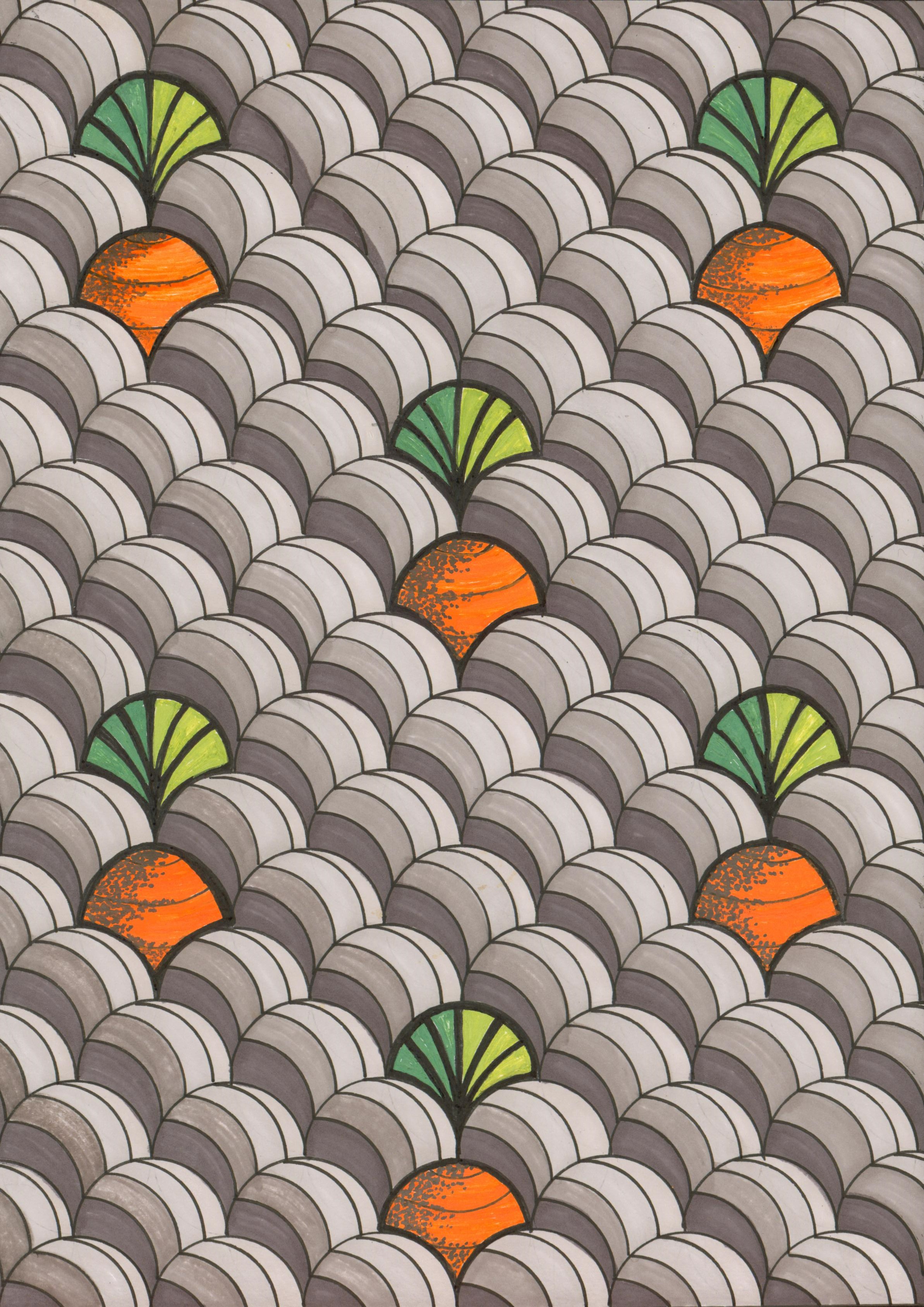 This is a geometric design of a carrot patch worked with marker and felt tip pen. The link to the 1980's is the grey of the soil, a big colour in interior design back then and the florescent colours of the carrots which was big with clothing in the 1980's. A very loose link to the 1980's I admit.