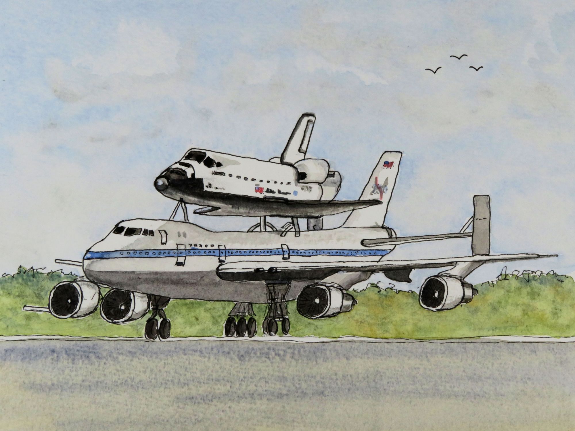 This pen and watercolour image might represent a slightly unusual interpretation of the '1980s' theme, but it provides me with a reminder of when I was lucky enough to see the Space Shuttle 'Enterprise', piggy-backed on its adapted Boeing 747, when it visited Stansted Airport during its European promotional tour of June 1983.