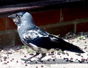 Over a few years Catherine has had several jackdaws with white markings. She has one this year who is almost pied. She always has first choice of the food, she's not bullied by the other birds, and they wait until she's got a beak full before tucking in themselves.