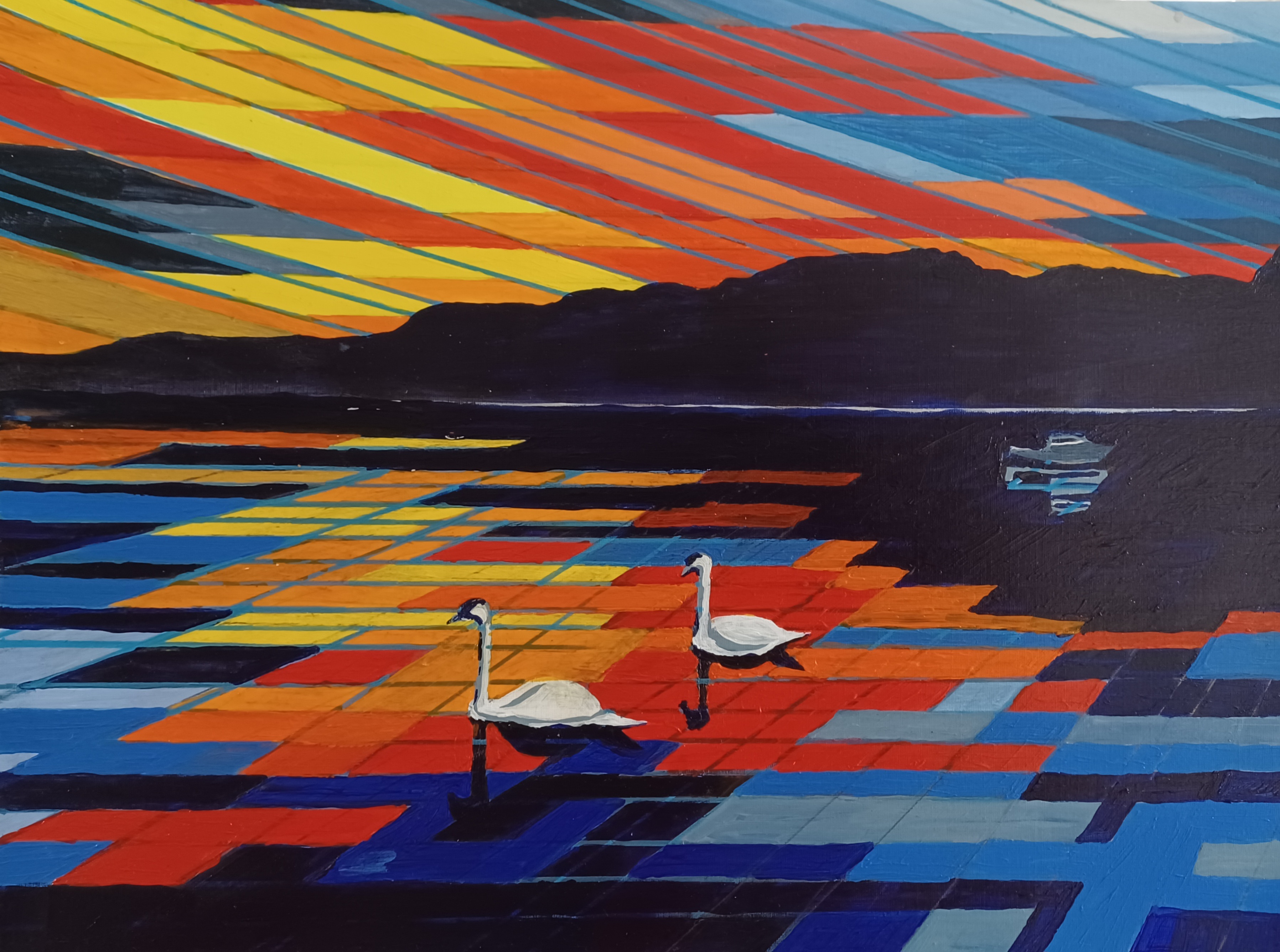 My picture is painted in acrylic and I was inspired by a photograph a friend sent me of a sunset over Loch Ness in Scotland.