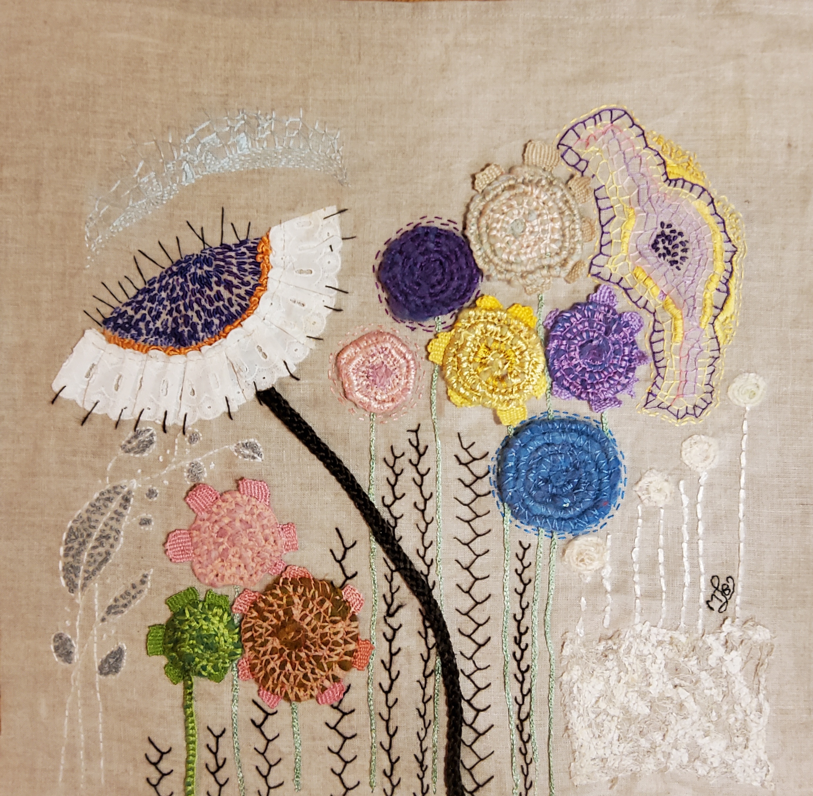 My embroidery textile creation is experimenting with 'Colours' and shapes. All materials used are left-over threads and cloths.