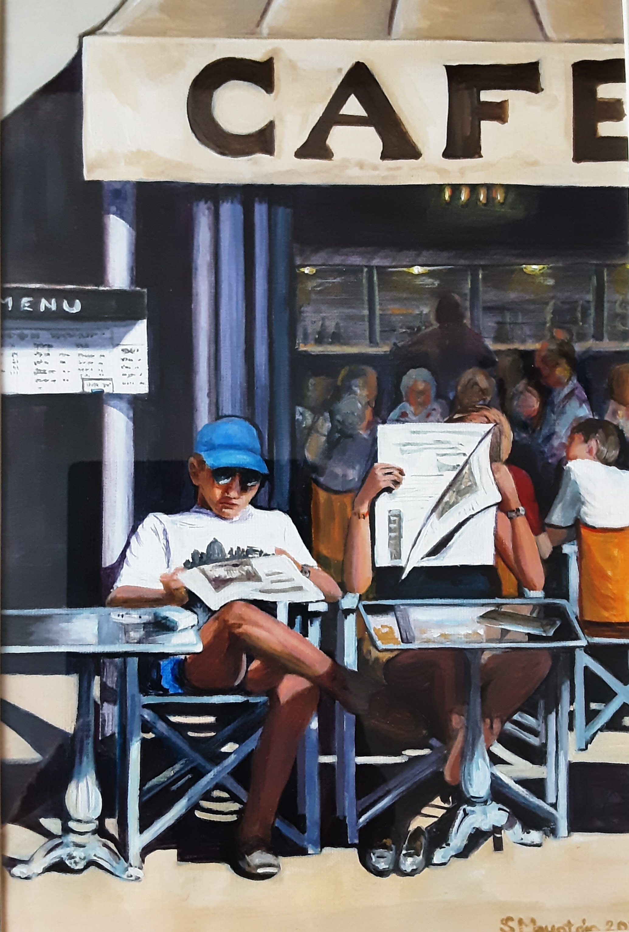 Acrylic, composition from several photos. People watching is wonderful, especially sitting at a French Cafe. I loved the way she kicked off her shoes and rested her bare feet on the cool metal of the cast iron table leg.