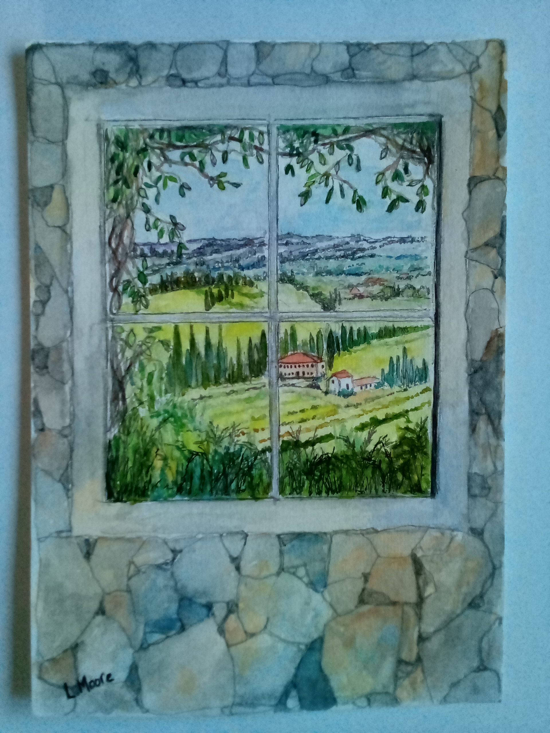 A view of Tuscany hillside from a window . Painted using watercolour.