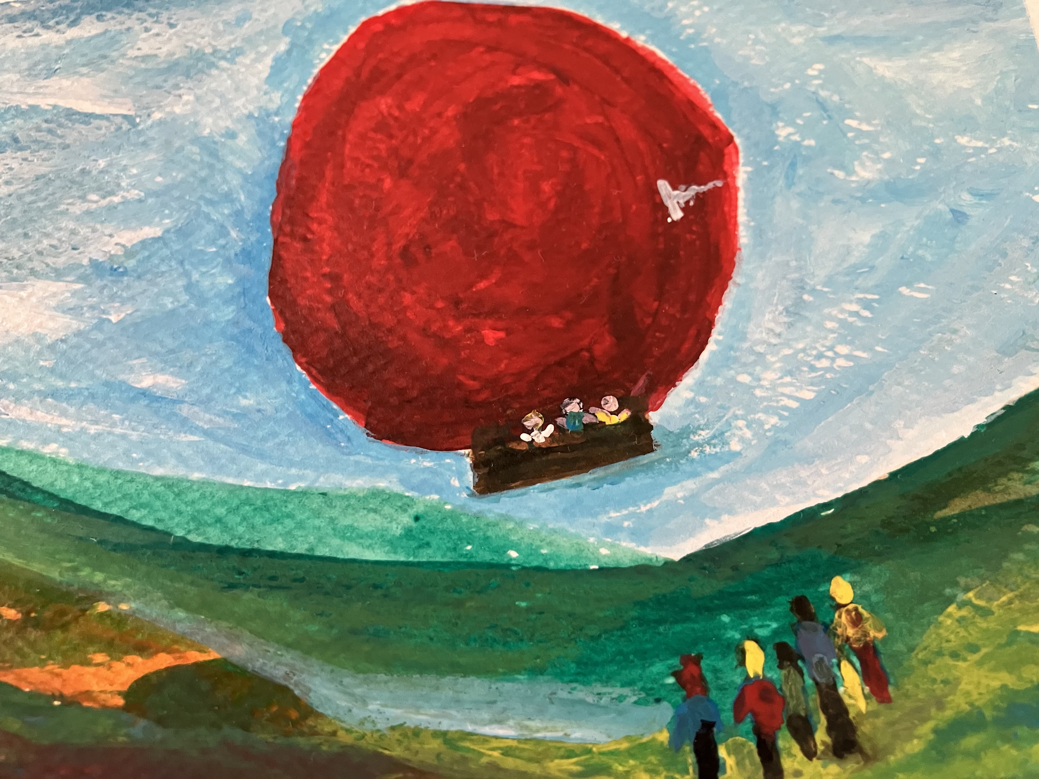 This is my interpretation of it as I thought that the people in the balloon were looking down at the people below from afar and the people on the ground were looking up at the balloon from afar.