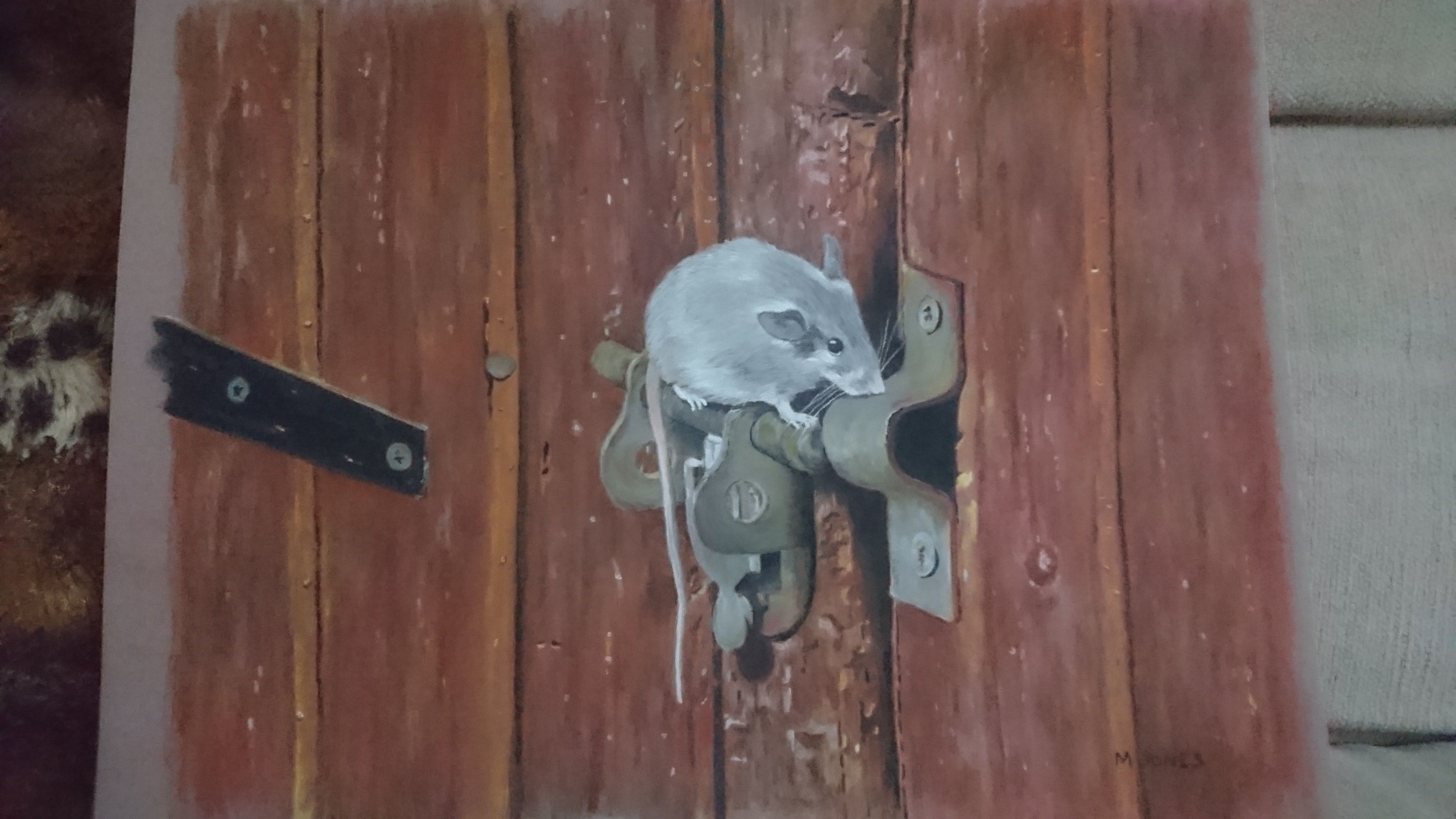 A pastel pencil drawing of a mouse trying to find its way out.