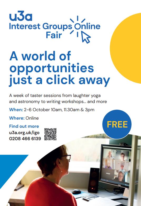 At the start of October, Interest Groups Online (IGO) held a free online Fair which anyone could attend. There were 14 taster sessions attended by a over 400 people - a mix of IGO members, u3a members and prospective members.