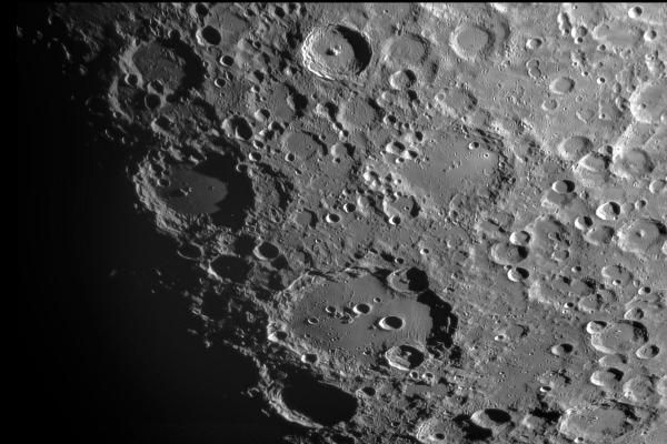 Clavius crater on the Moon with its crescent of 5 younger small craters inside. Clavius is 144 miles across. The Clavius Base featured in the film '2001, A Space Odyssey' is not visible.