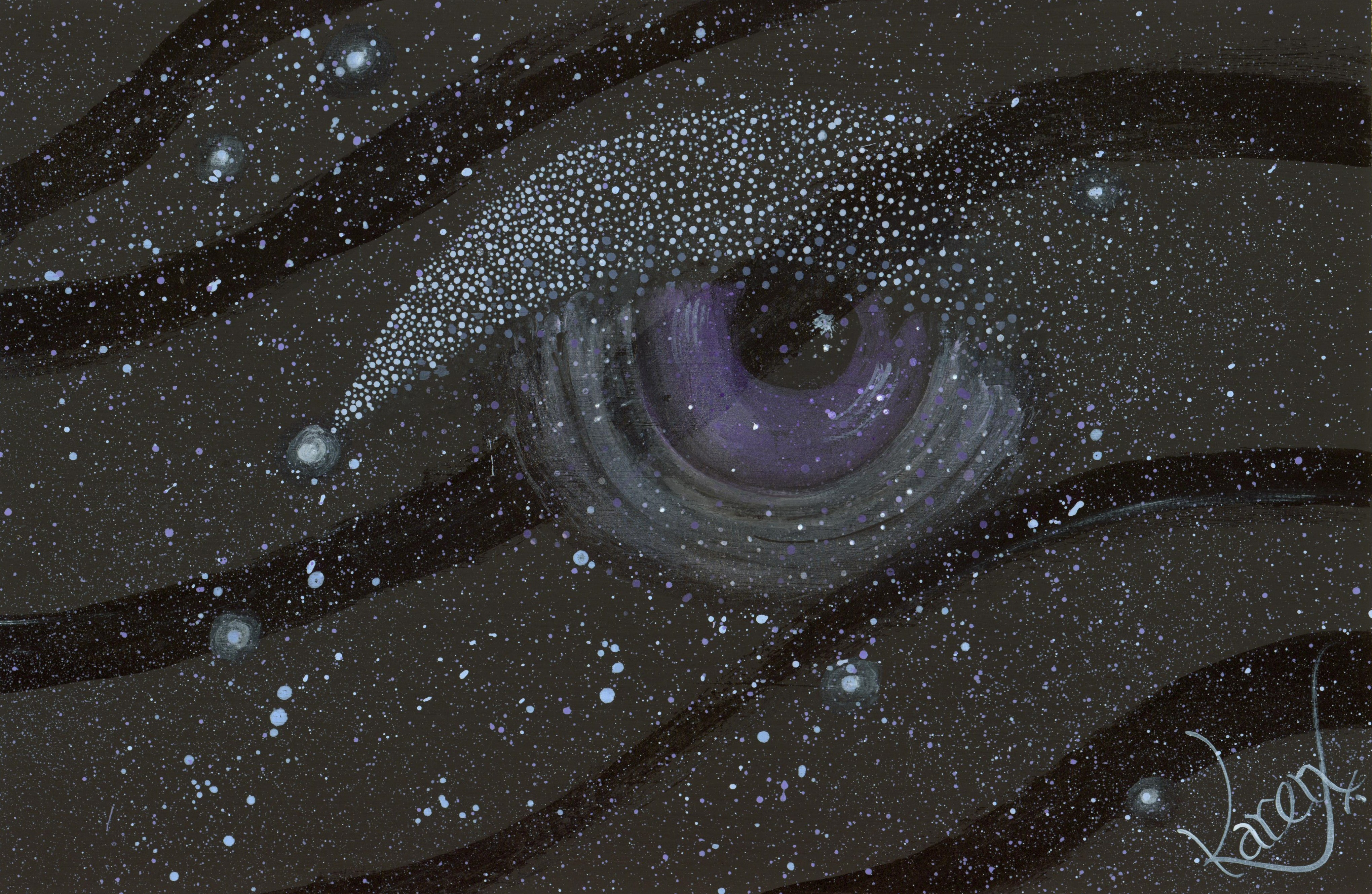 ixed media, acrylic paint, gesso, gloss medium and white pen. This piece depicts phenomena in space, comets, black holes planets and stars all meeting at one point in space to create an eye in the sky. Science, science fiction and space are not subjects that I warm to. As a child I tried to understand creation beyond our solar system and the infinity of it was too overwhelming. What I am really pleased with is the gloss medium over the black gesso creating a clearing in the atmosphere.