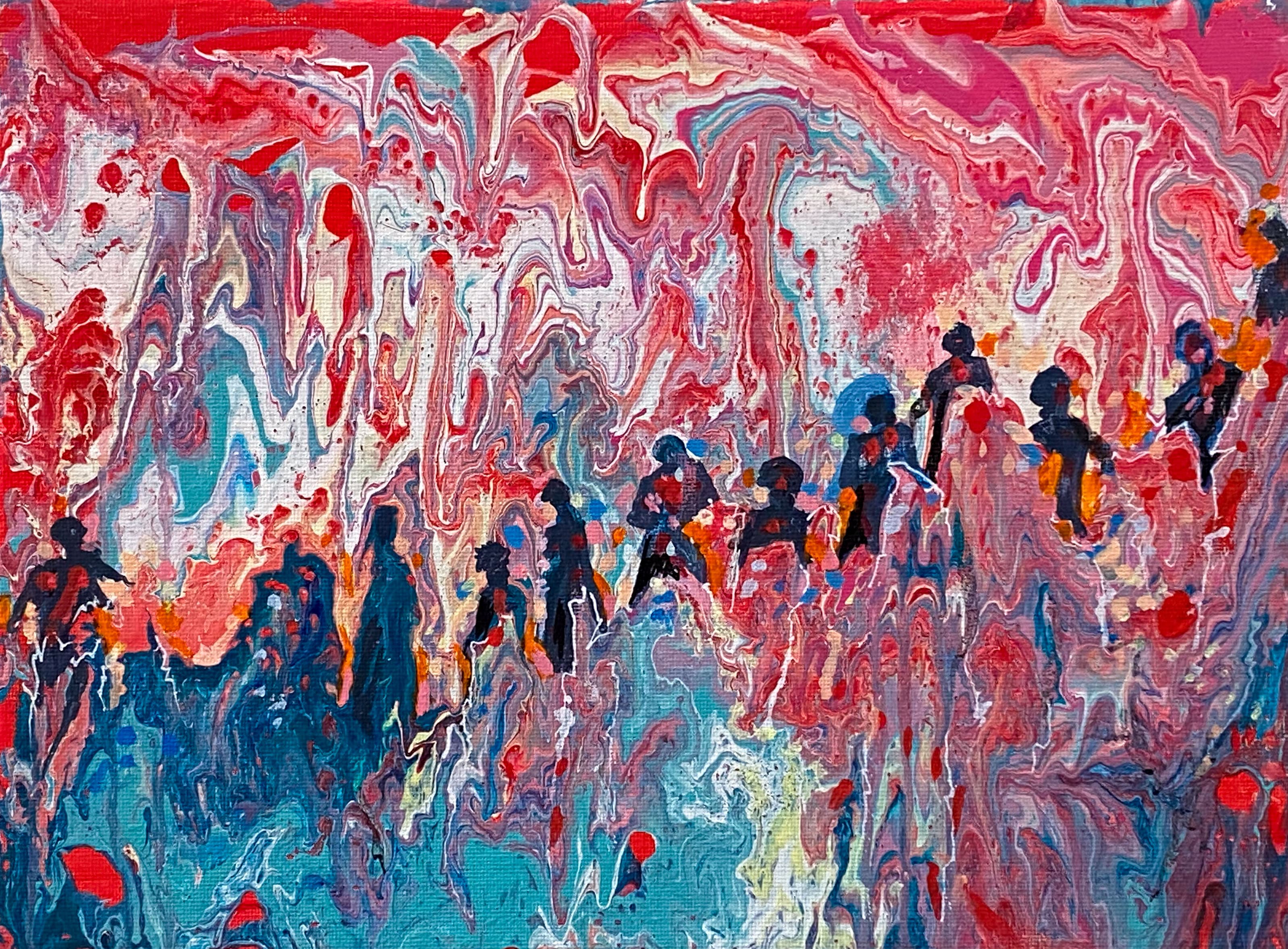 Experimenting with the freedom of acrylic paint pouring, I encouraged the medium to flow freely across the canvas. Then noticing the suggestion of a figure amongst the 'lava', I added others to the very hot environment.