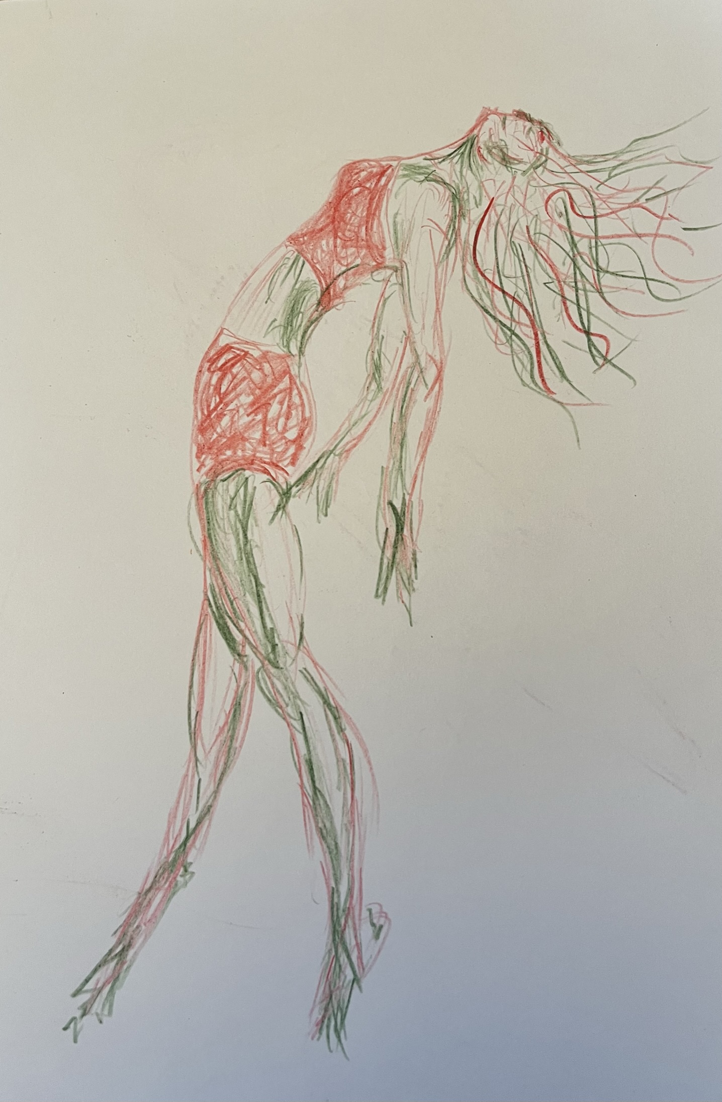 In our art group we were doing quick sketches using two coloured pencils. We had some photographs to use as prompts and I chose a dancer. I don't usually work in pencil and it is very rare that I draw people but the idea of a quick sketch gave me the confidence to try. The image demonstrates both the freedom of the dancer and my freedom of expression.