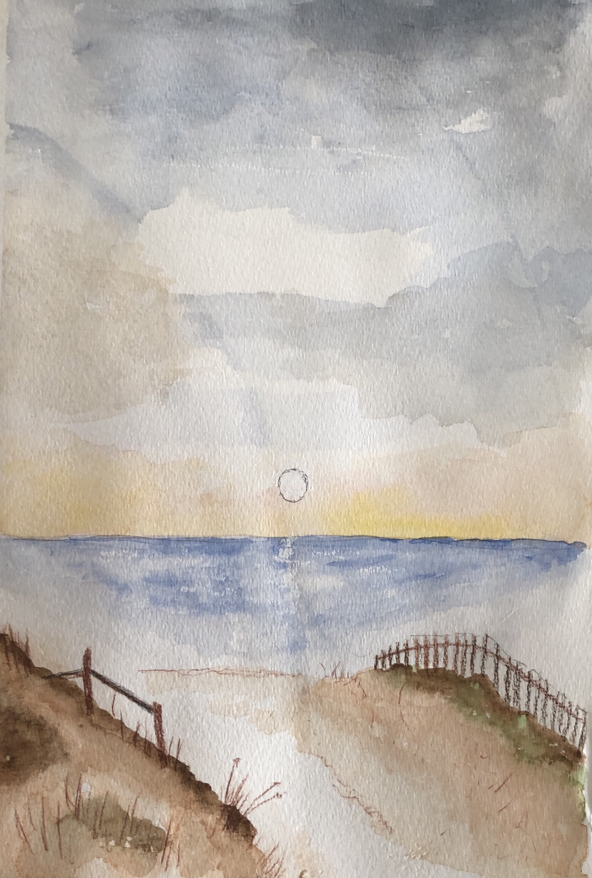 Freedom to walk on beach. Watercolour with white correction fluid