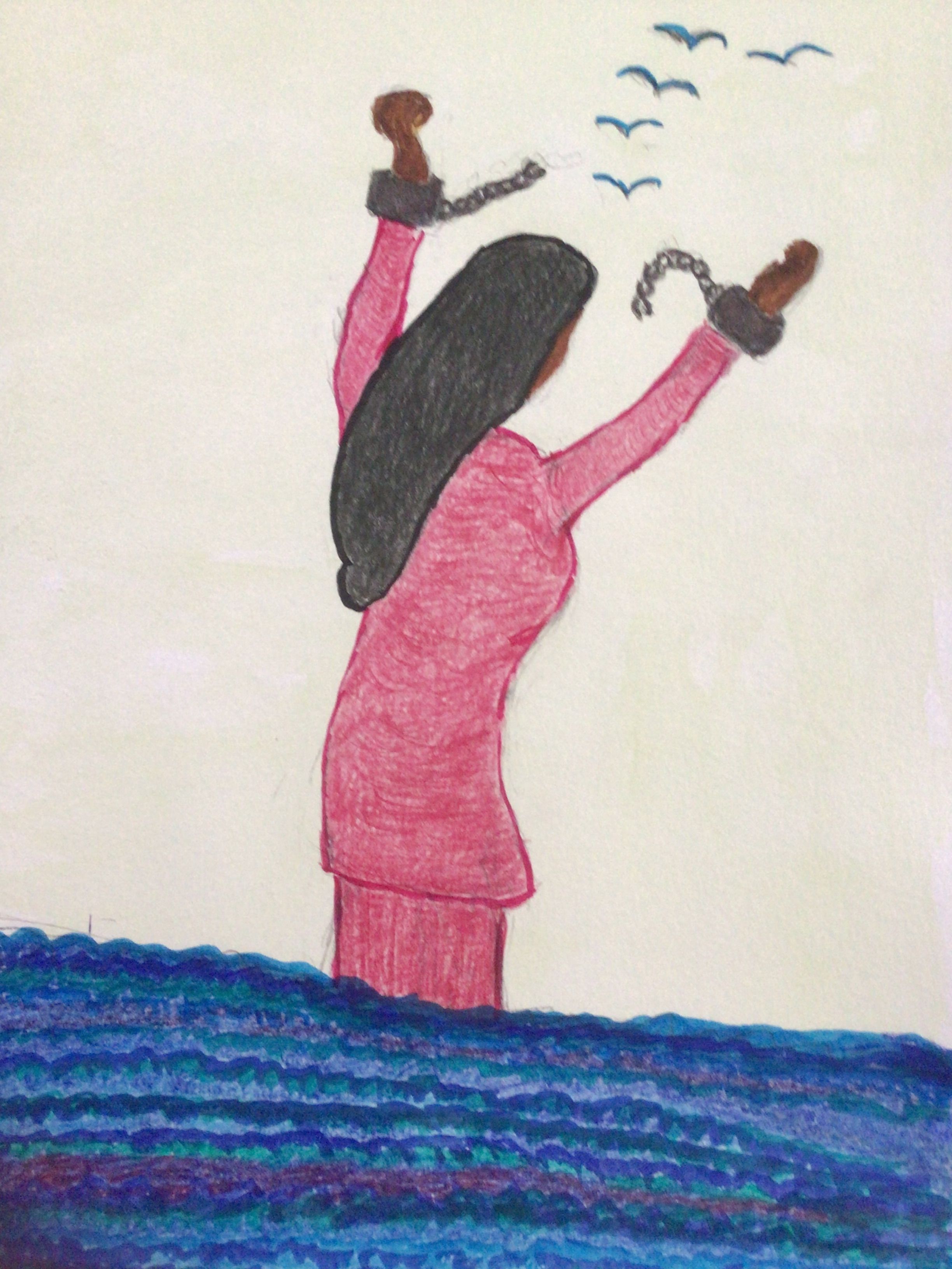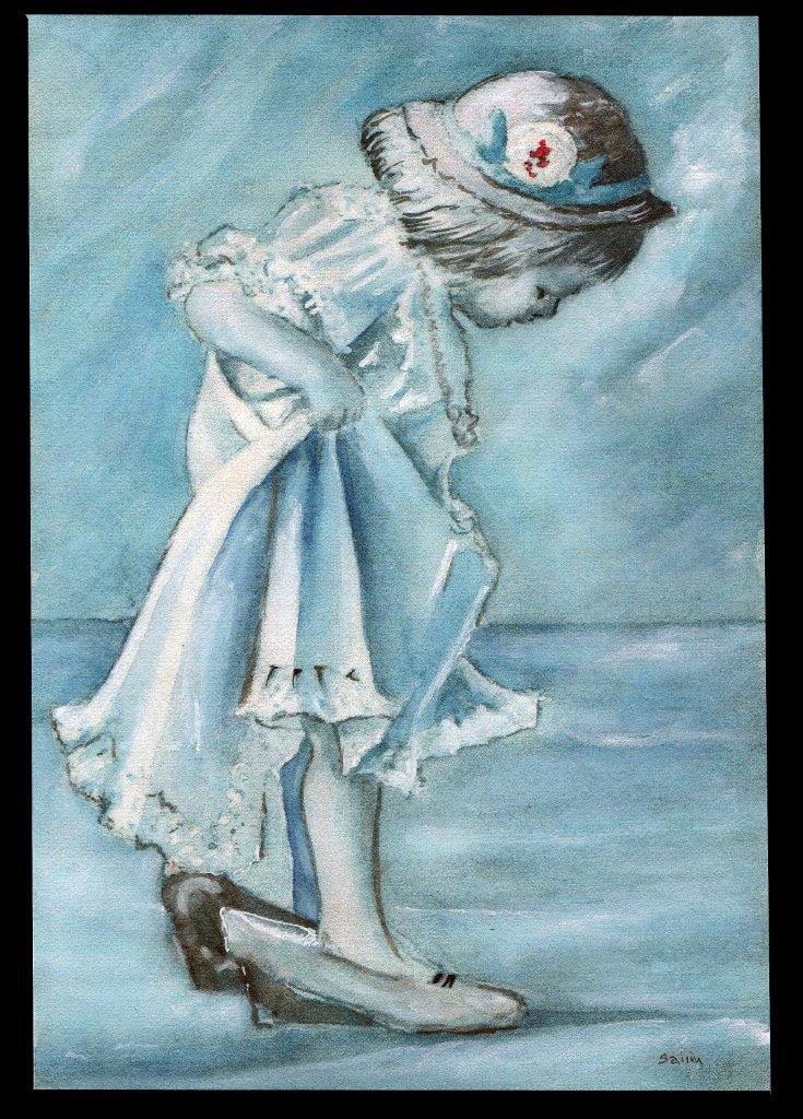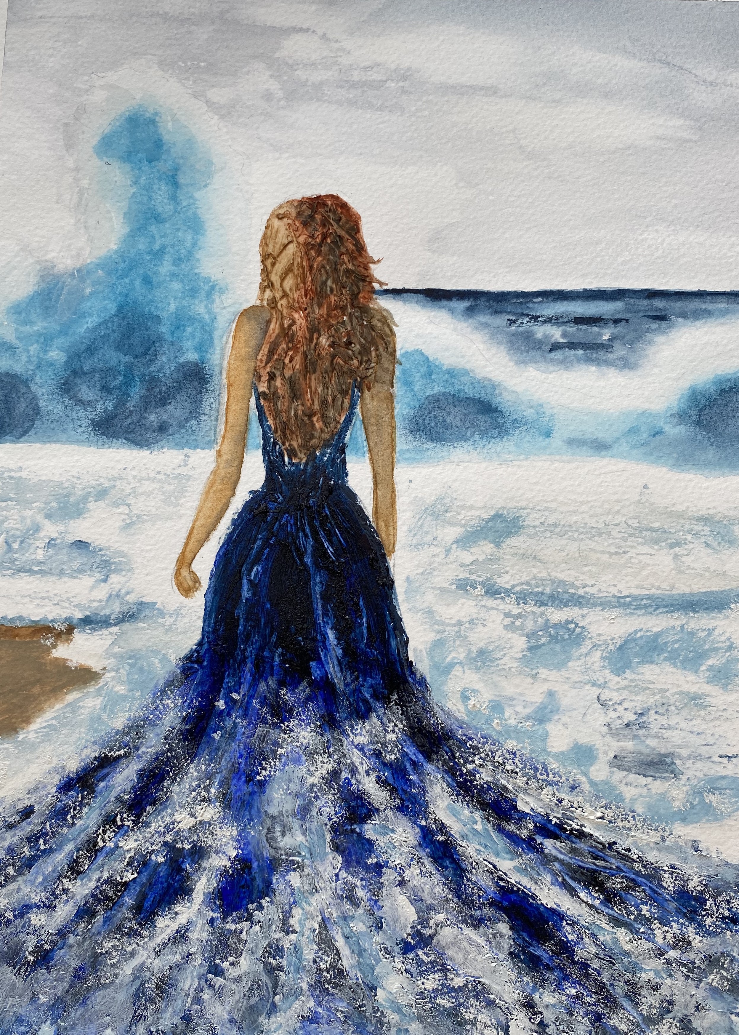 Freedom… this a mixed medium picture, water colour and gel, the picture is of a young woman walking into the sea, the freedom of not worrying about what you are wearing.