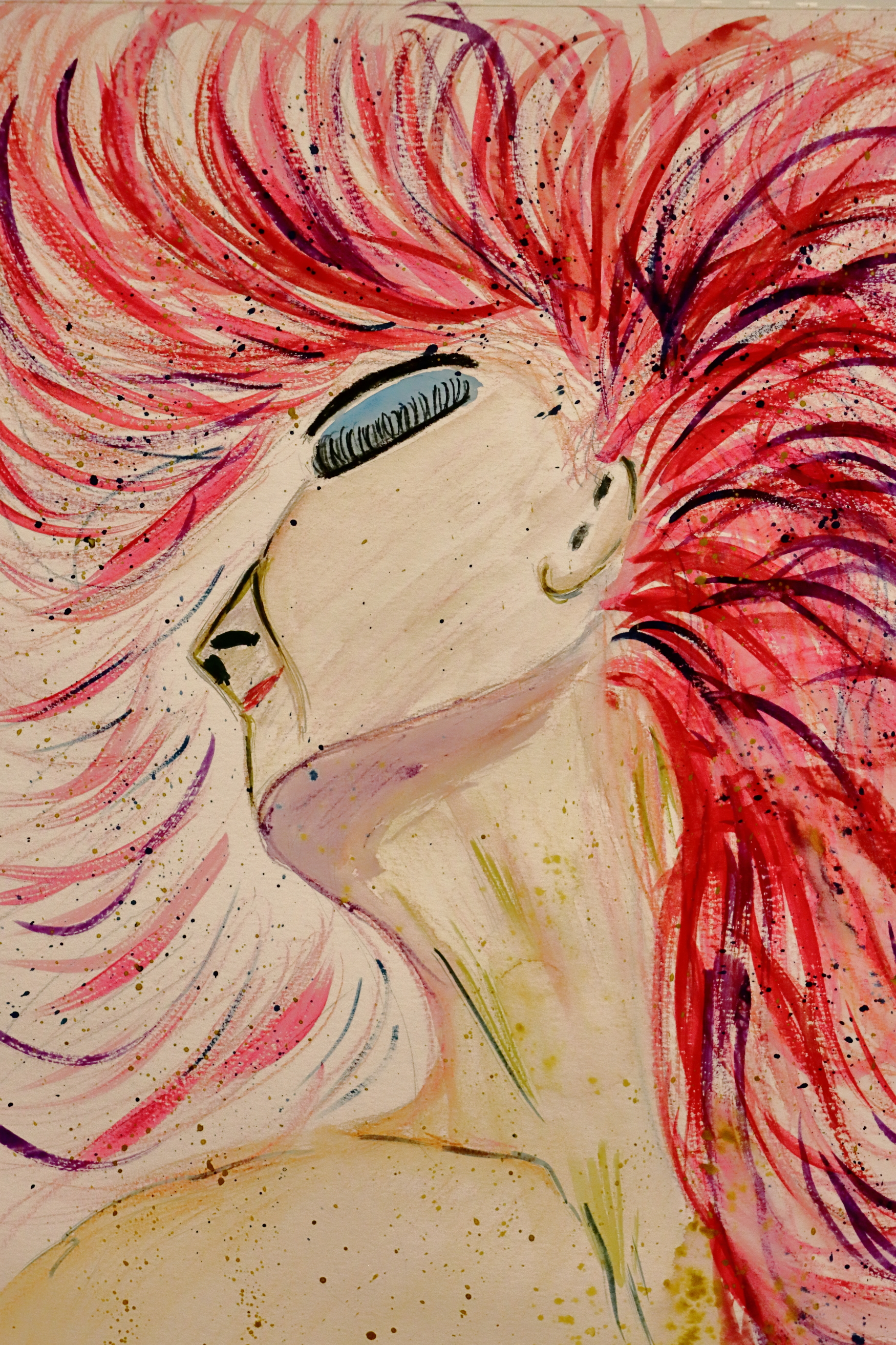 Feeling free a watercolour - the colour of my hair as an 80's new romantic, a wild mane untamed, flowing high and free. Bright blue eye shadow, a blast from the past of the 70's, experimenting with make up. The freedom of discovery to be me.