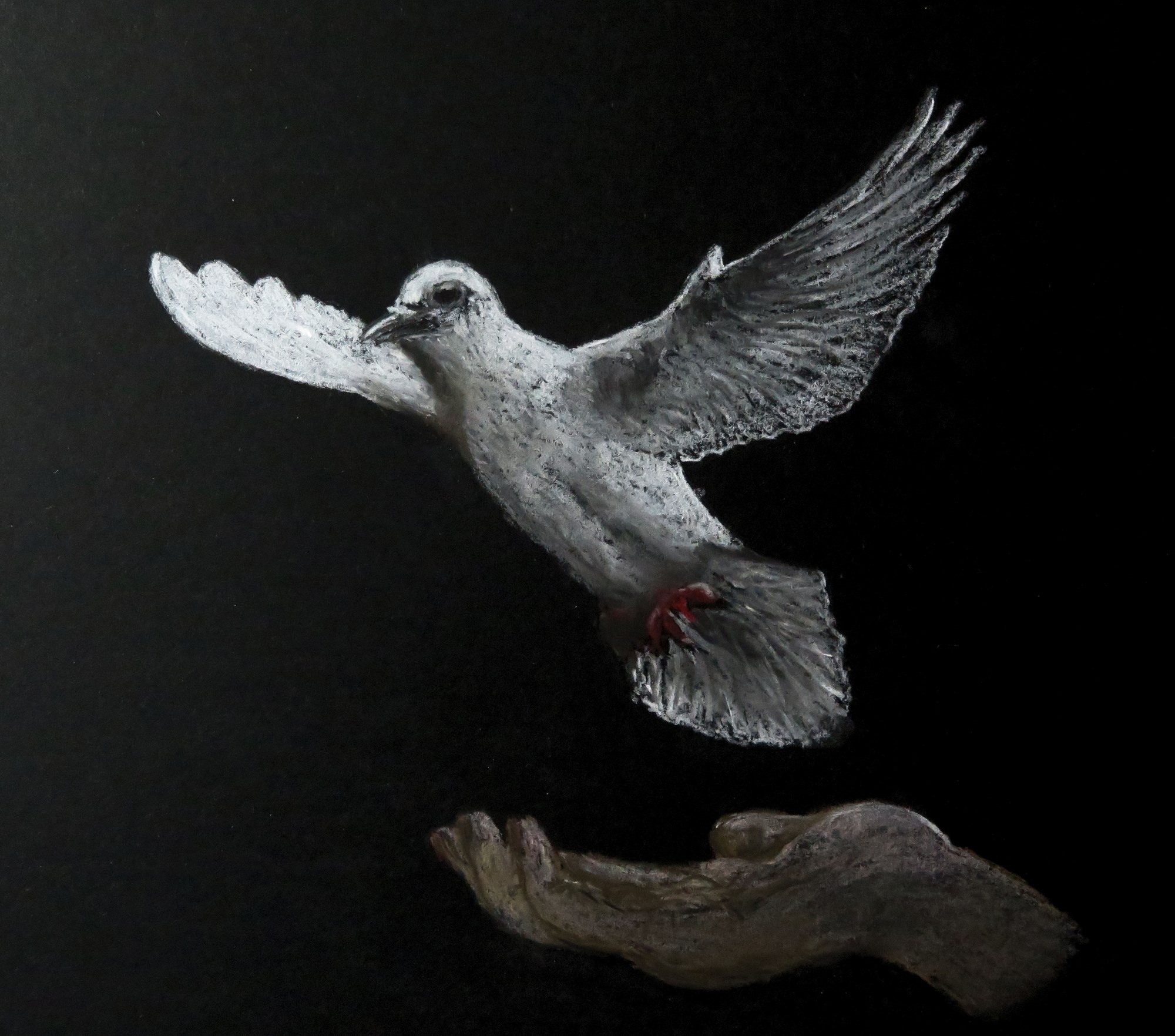 A Pastel Pencil drawing on black paper depicting the start of this bird's new found freedom.