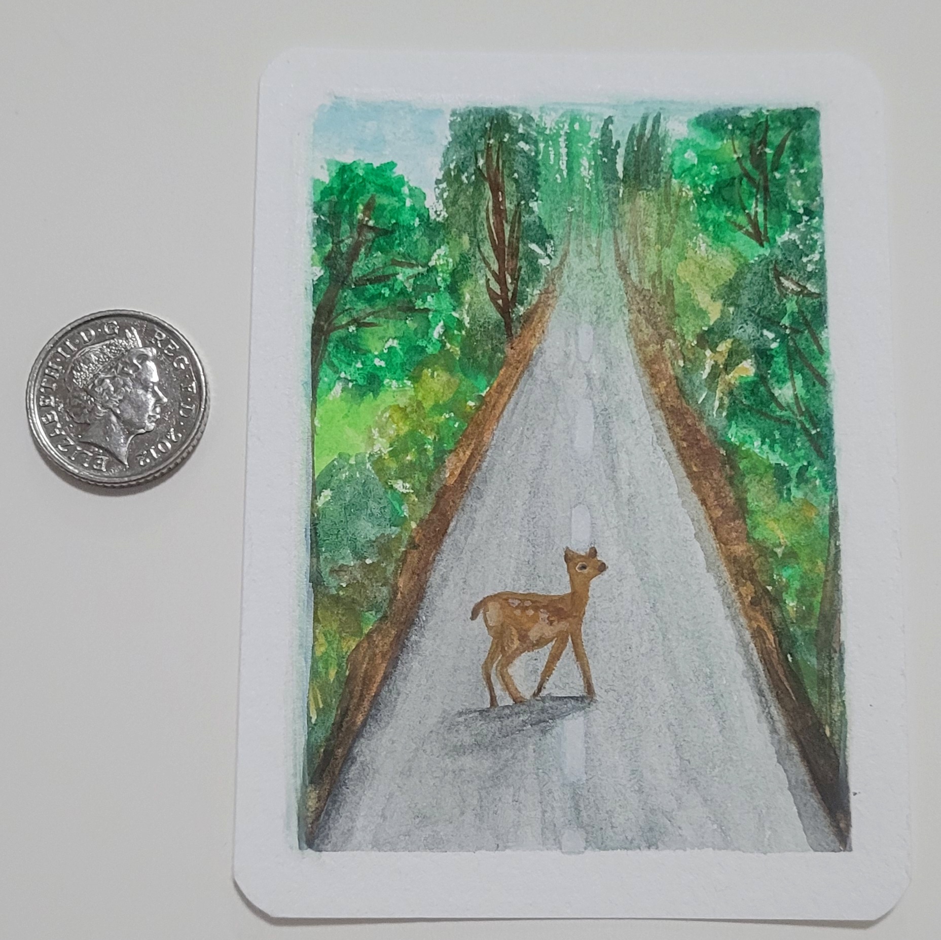 Lately I have been really into creating mini watercolour paintings, as they are quick to do, meaning I can still create something even if I don't have much time. My inspiration for this painting came from studying human impacts on the natural environment. For example: how roads divide habitats, restricting animal movement and disrupting ecosystems.