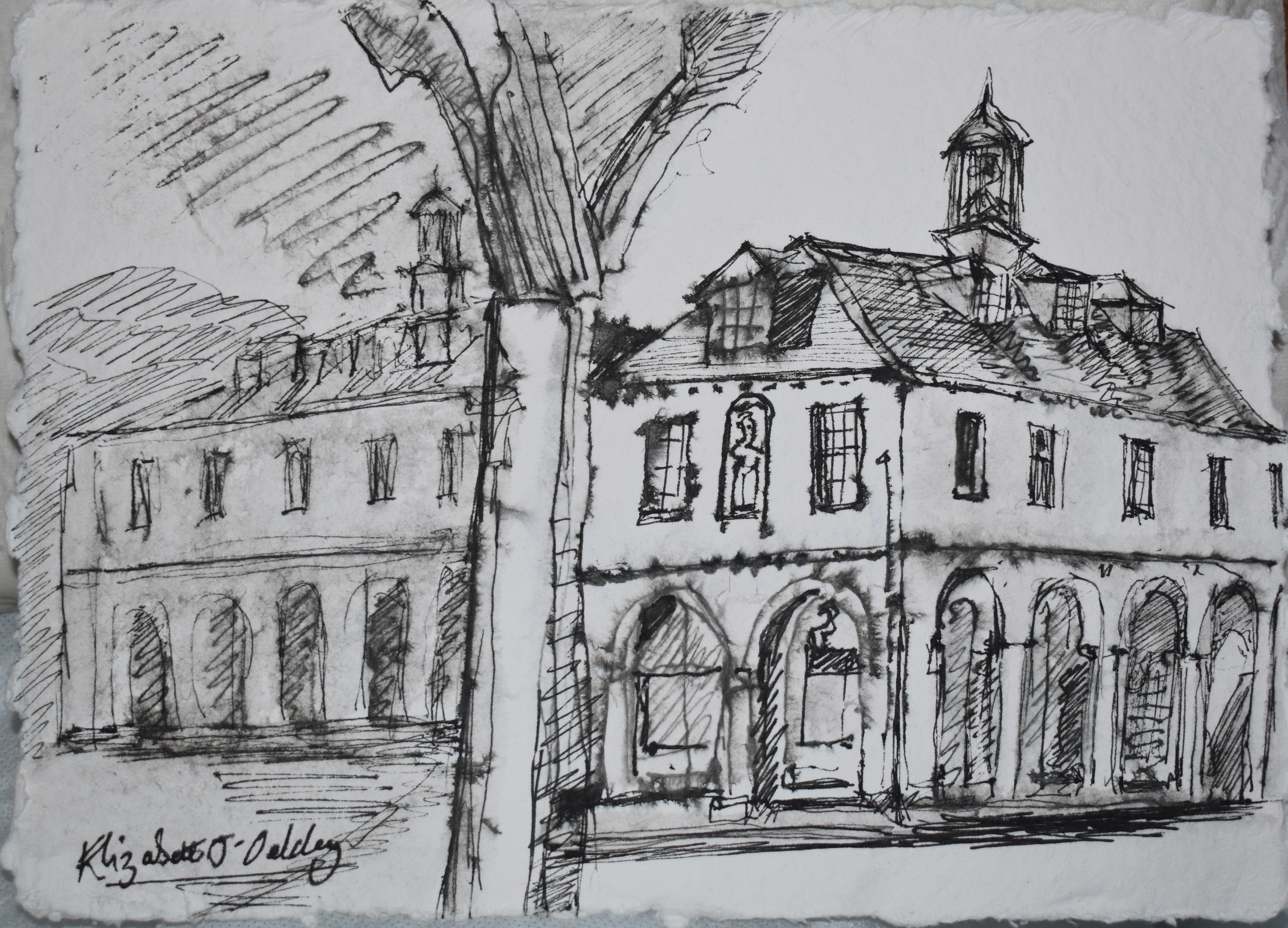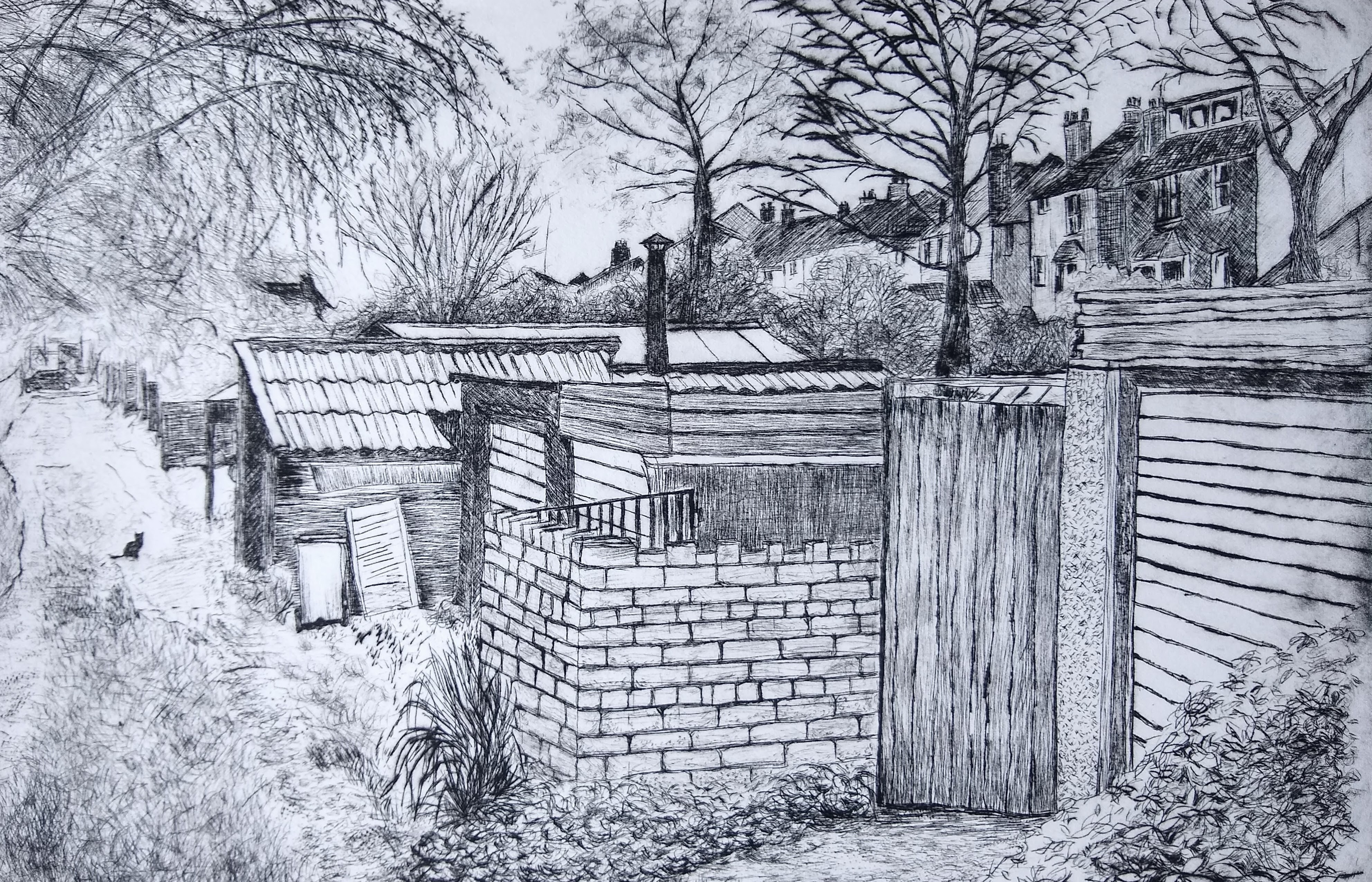 I'm not sure if this is eligible as it is a handmade print, drypoint engraved into perspex, hand inked and printed, but it is basically drawn. I was concentrating on the image and forgot to do it in reverse- so the print is a reversal of the view! It's also a reversal of going out to the countryside for walks, I walked slowly in the enclosed back lane behind our terraced houses, and my cat was happy because she likes a companion when exploring.