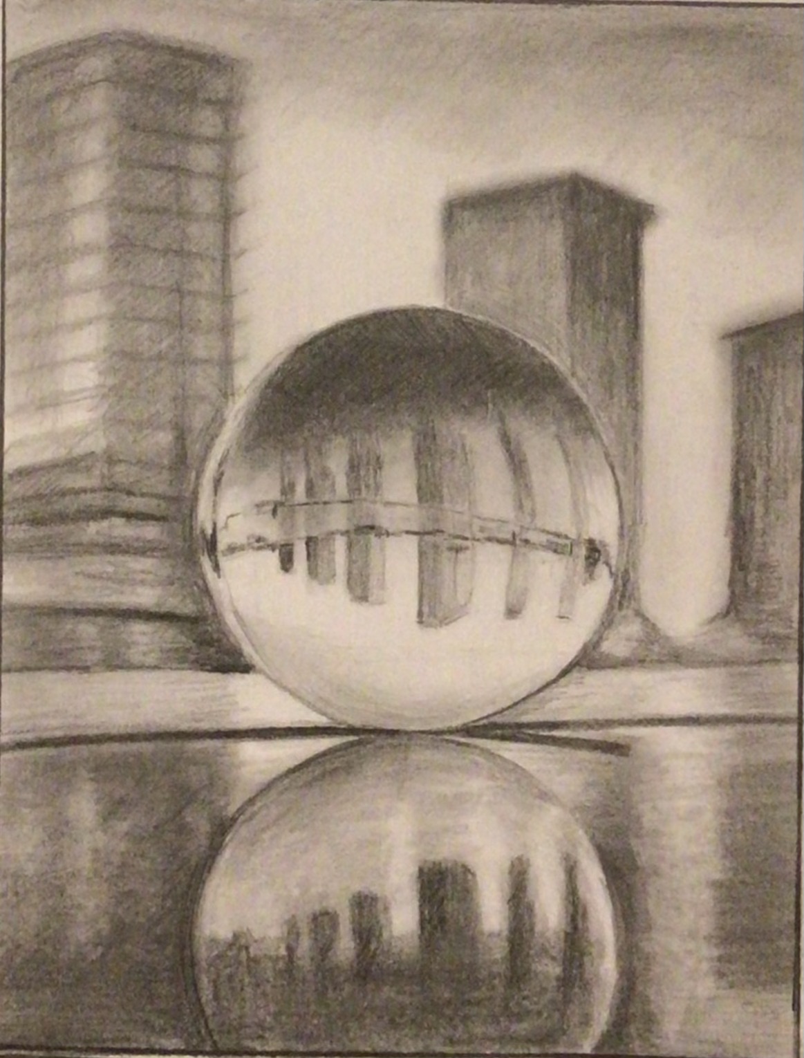 Pencil on cartridge paper. Referenced from a photograph using glass ball to reverse the image.