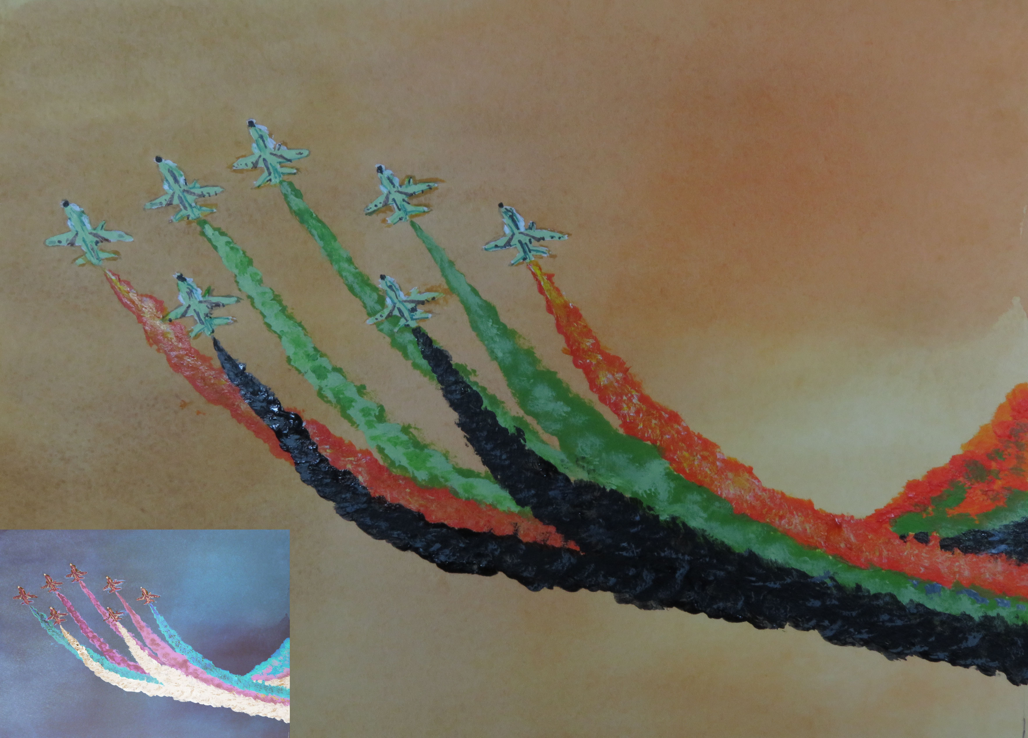 As my entry for the theme I have attempted to create a 'colour reversed' version of an (essentially) Red, White and Blue image of our favourite Aerobatic Team in action. The process involved replacing all of the original colours with their complementary colours and thus produce a 'Colour Negative' effect. So, for example, Red became Green, White became Black, and Blue became Orange (plus all of their various mixing shades, tints and tones etc). I chose to use a watercolour background, with acrylics and fineliner coloured pens for the foreground and detail. The small inset picture at the bottom left, shows my image 'photographically reversed' to recreate a 'positive' version of the original, for comparison.