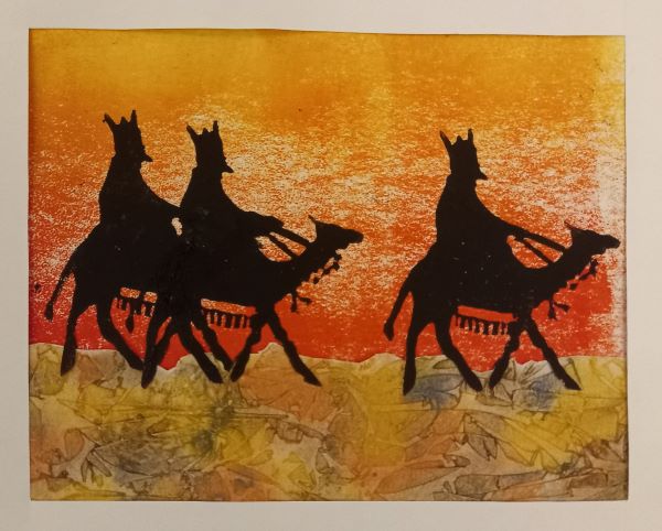 I've combined watercolour using clingfilm for the land with a lino print of the wise men on camels.