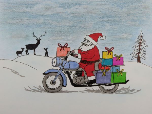 A seasonal image using black ink, coloured ink and coloured pencil on Mixed Media paper, depicting Santa Claus making good progress on his deliveries this year.