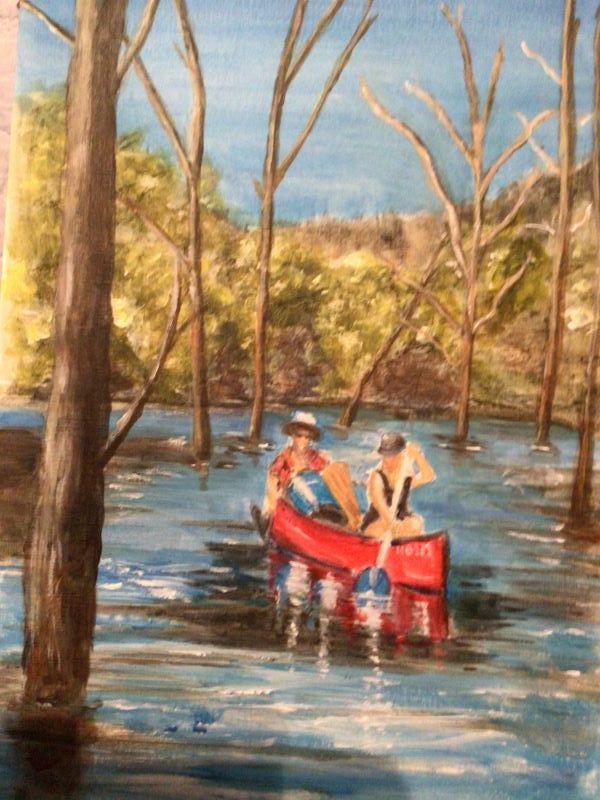 Camping in the wild by canoe painted in acrylic with a touch of pastel.