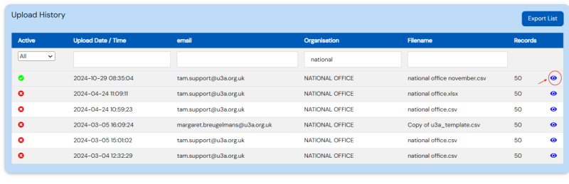 Once your file has been uploaded, you can check if the data in your file is correctly aligned by clicking on the eye symbol beside your file (see screenshot below).  If the data is not correctly aligned, with the correct information in each column, then please revise the data in the excel or CSV file and complete the upload process again.